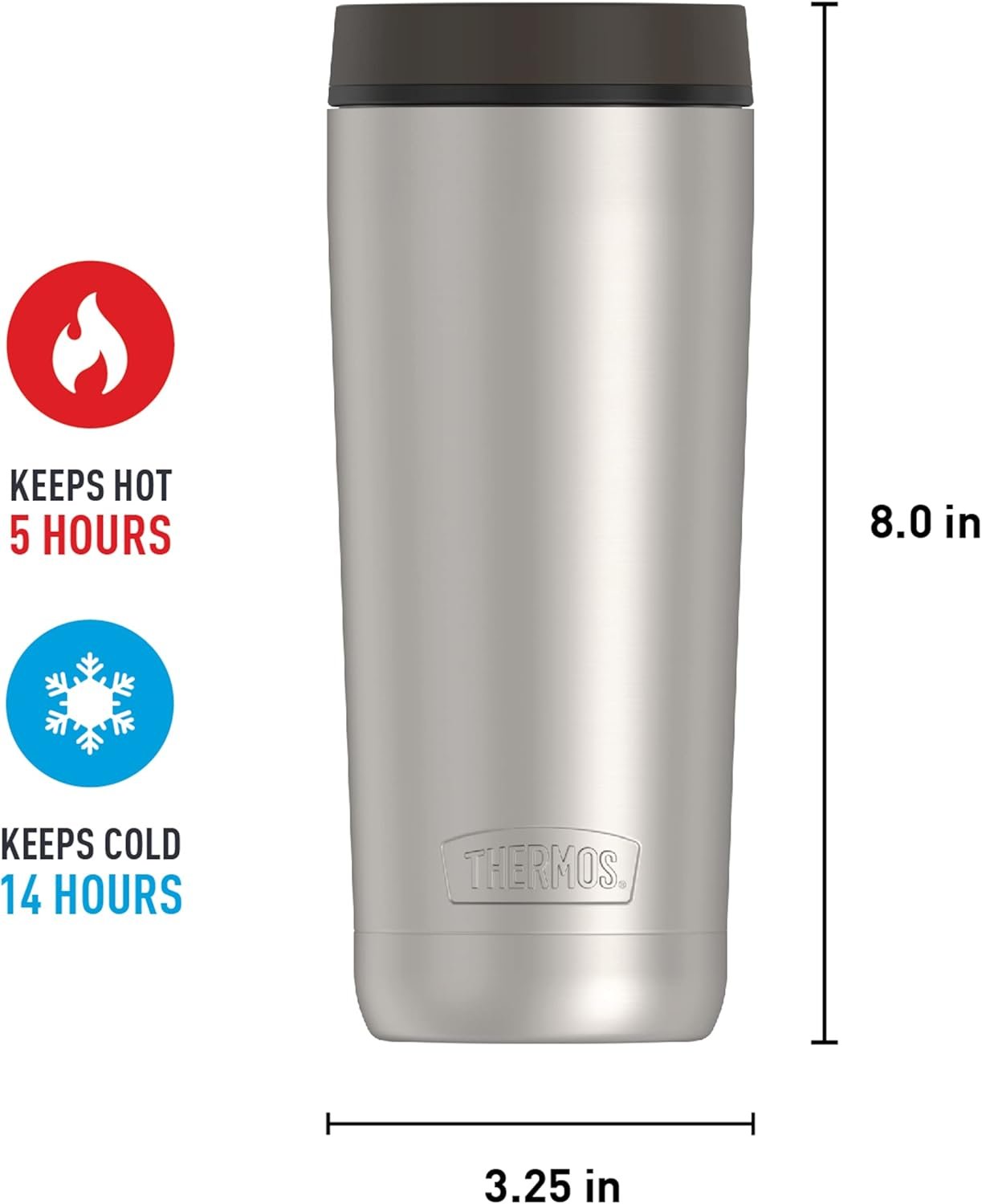 STAYS HOT OR COLD: THERMOS vacuum insulation technology for maximum temperature retention of hot or cold beverages. Keeps your morning coffee or tea hot for up to 5 hours and iced drinks cold for up to 14 hours