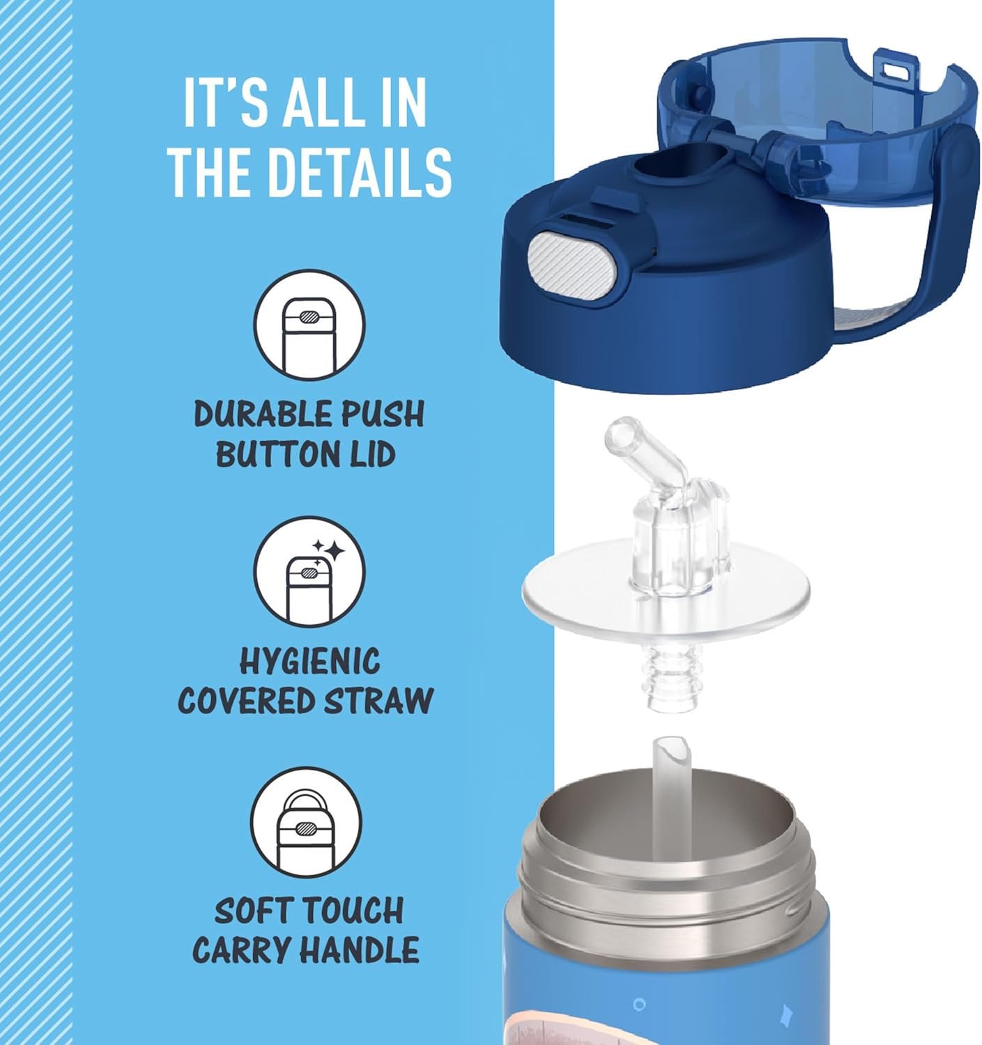 The FUNtainer® 12oz Vacuum Insulated Stainless Steel Water Bottle with Straw keeps drinks cold for up to 12 hours. Our kids water bottles are built so their drinks are as cool on the inside as they look on the outside. Kids stay hydrated and parents stay happy. The double wall stainless steel construction is built to handle drops, dings and assorted roughhousing. Includes an integrated carry handle with soft-touch grip, making it easy for kids to carry with them throughout the day. Includes a hygienically covered silicone straw which is removable for easy cleaning. To clean, you can pop your FUNtainer water bottle in the dishwasher; however hand washing is recommended. Not for use with hot liquids.