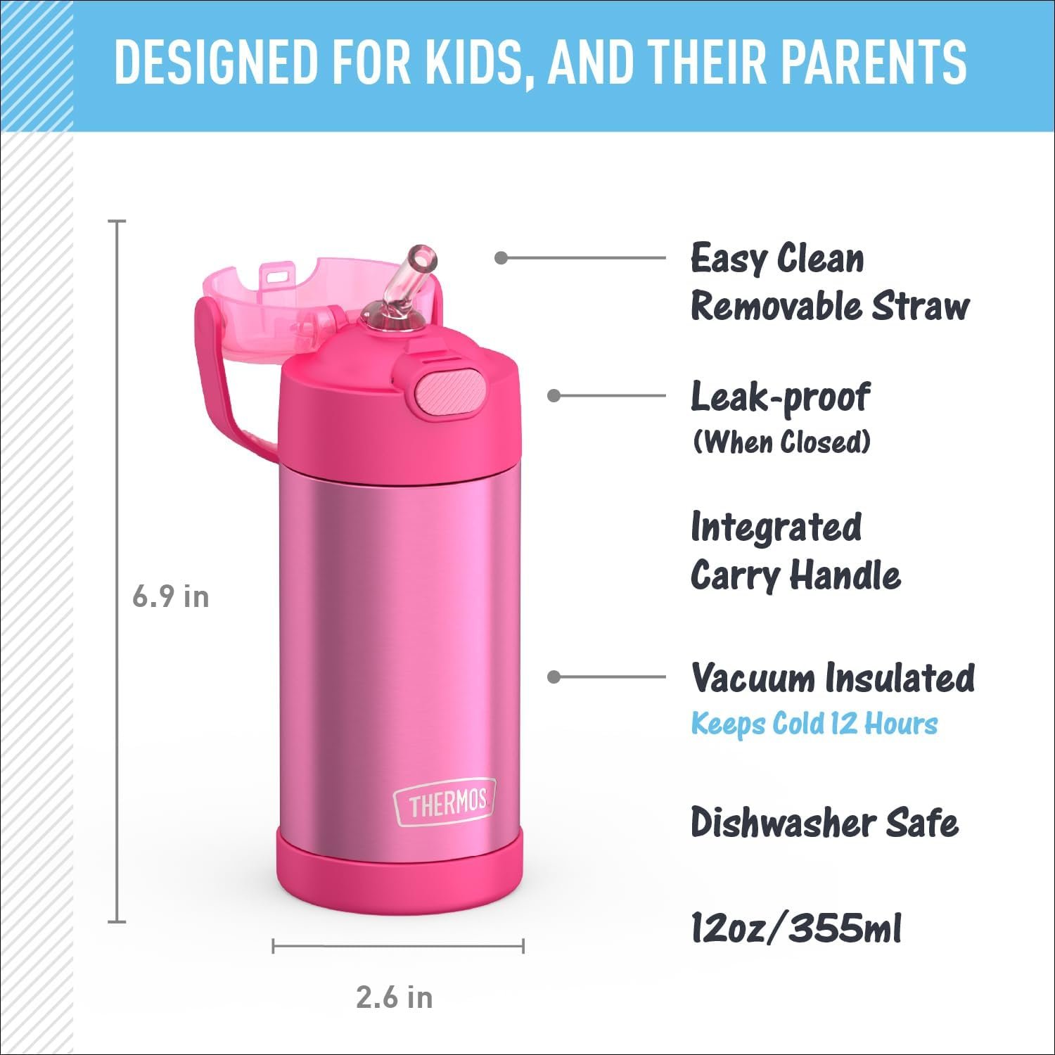 Easy care and cleaning: Help keep germs away with a hygienically covered pop-up straw that’s also removable for easy cleaning. This kids water bottle is dishwasher safe, though washing by hand is recommended