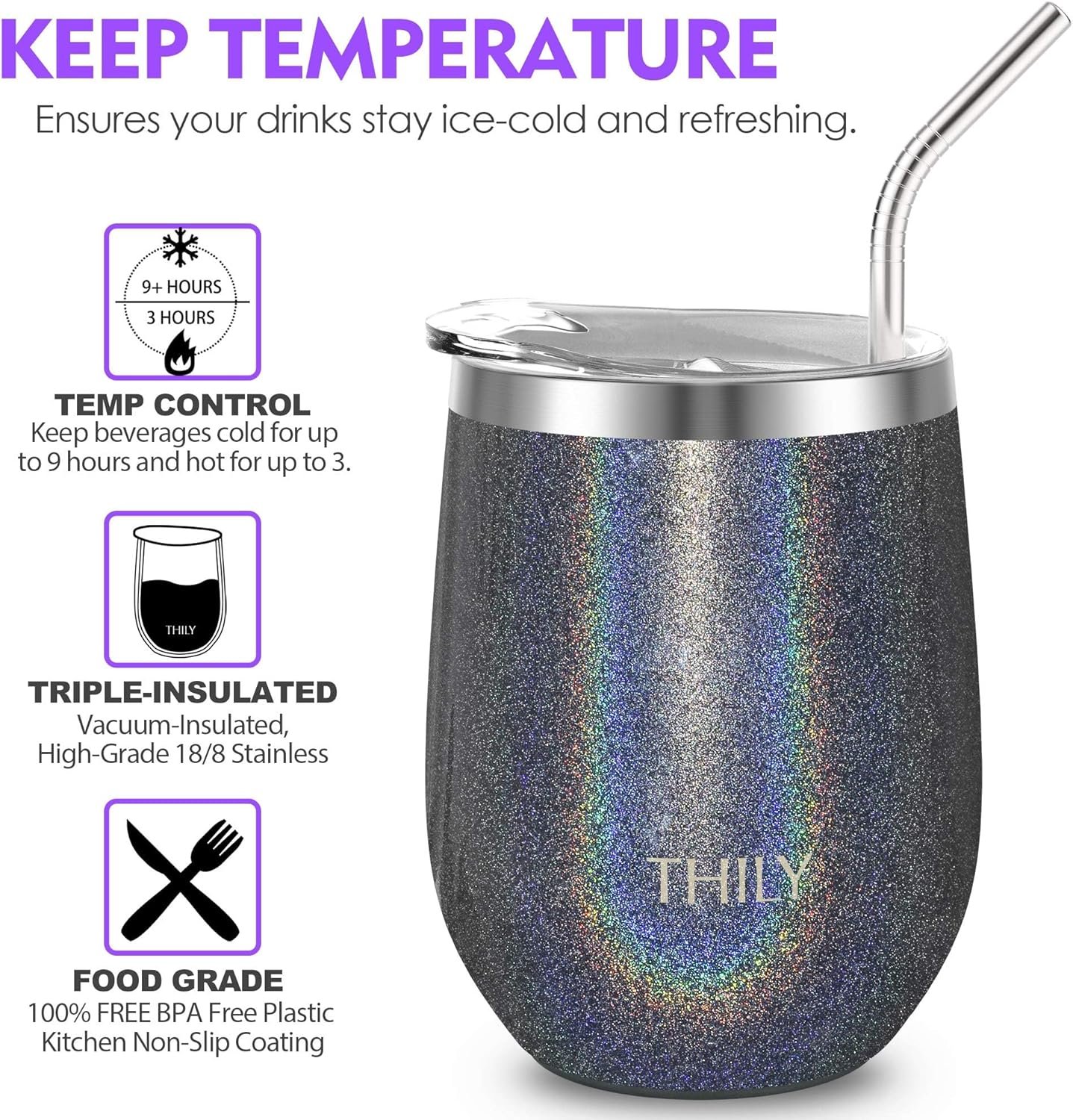 THILY 12oz Insulated Stainless Steel Wine Tumbler with Lid & Straw – Stemless Travel Cup for Coffee, Beer, Wine – Hot/Cold Drinks – Glitter Gray