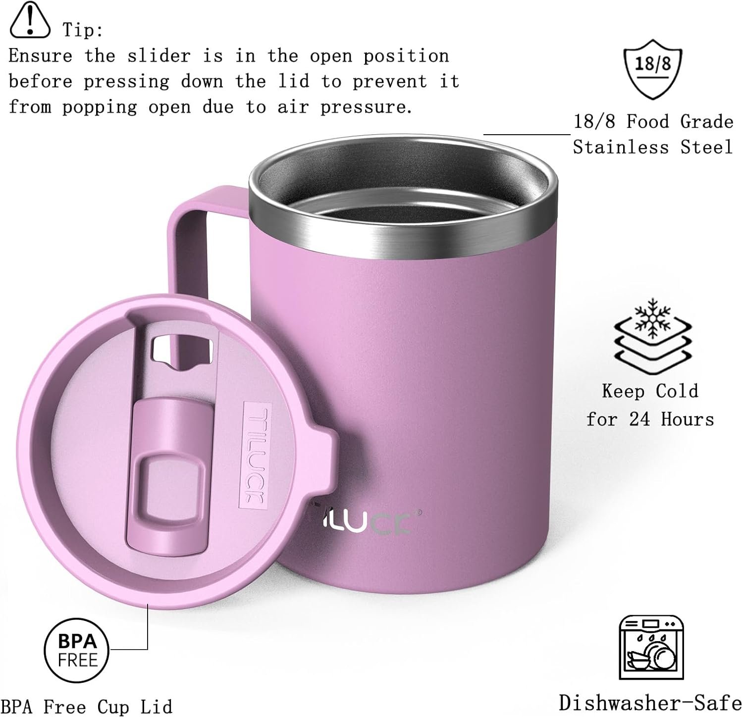 【Tumbler with Press Lid】Equipped with TILUCK press-type cup lid, it can be sealed or opened with an easy slide, which simple and easy to clean