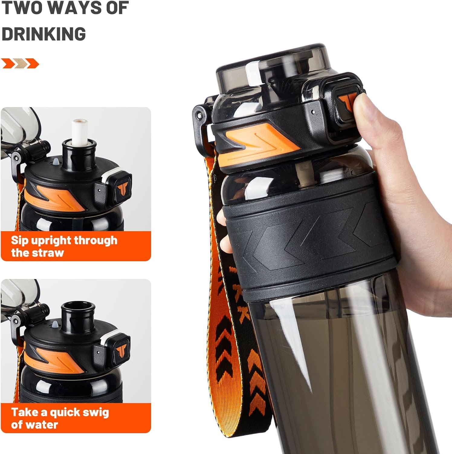 TKK Sports Water Bottles with Removable Straw 34 oz Leak-proof Flip Top Lid BPA Free Tritan Bottles with Strap for School, Fitness, Gym, Outdoor, Black