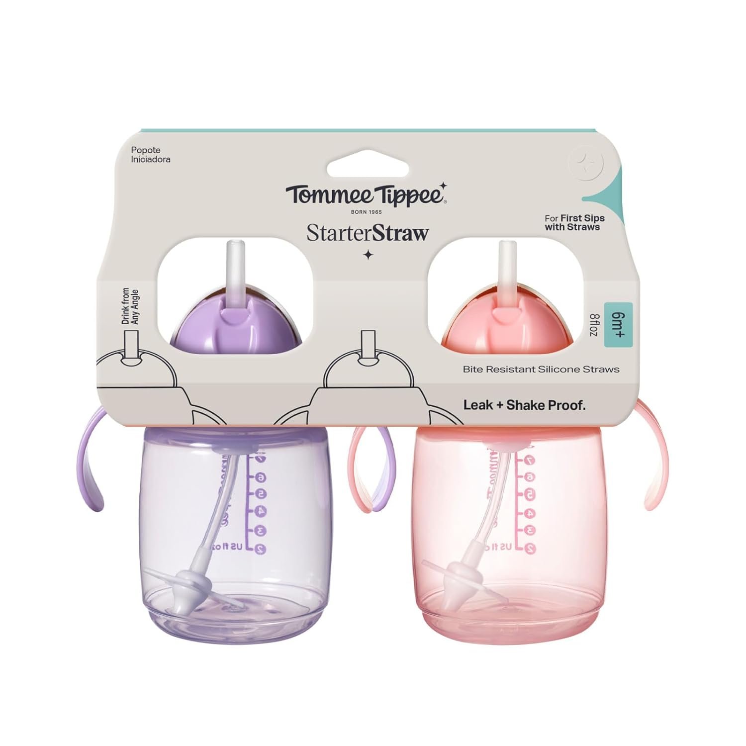 Tommee Tippee Starter Weighted Straw Baby & Toddler 10oz Sippy Cup for 6 Months+, with Silicone Weighted Straw and Easy-Hold Handles, BPA Free, Pink & Purple, Pack of 2