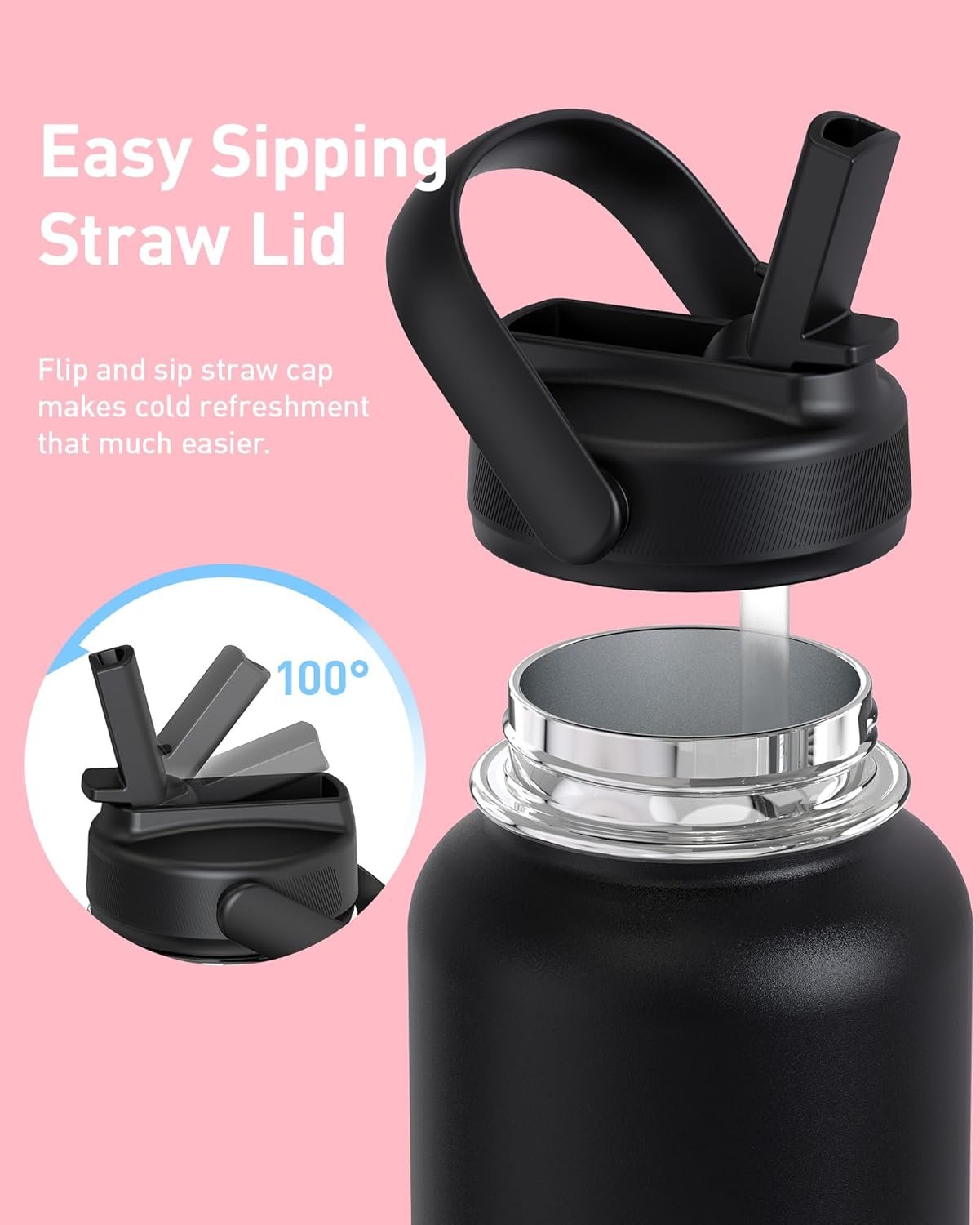 100% Leak Proof: 32 oz stainless steel water bottles with leakproof flex straw lid feature a secure and tight seal to prevent spills and leaks. The adjustable top handle is easy to carry with confidence!