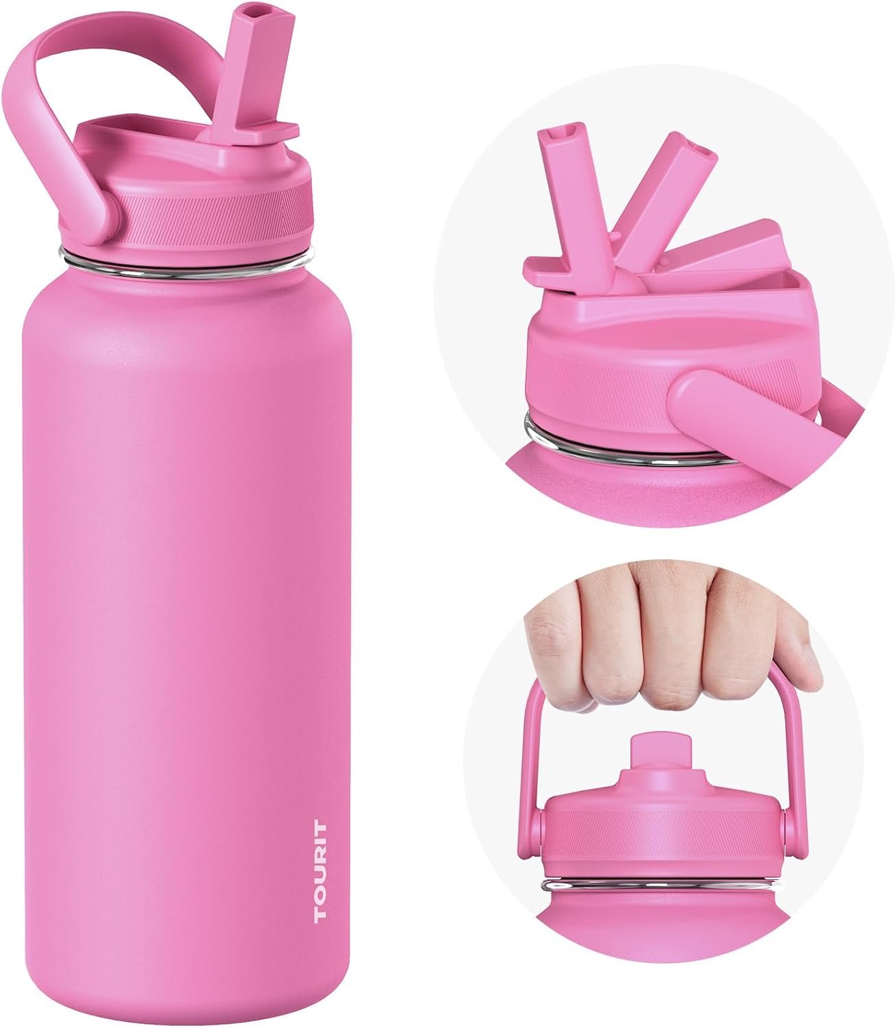 TOURIT 32 oz Insulated Water Bottle, Stainless Steel Water Bottles With Straw, Double Wall Vacuum Metal for Cold and Hot Drinks, Leak Proof BPA Free Flask for Sports and Travel, Hot Pink