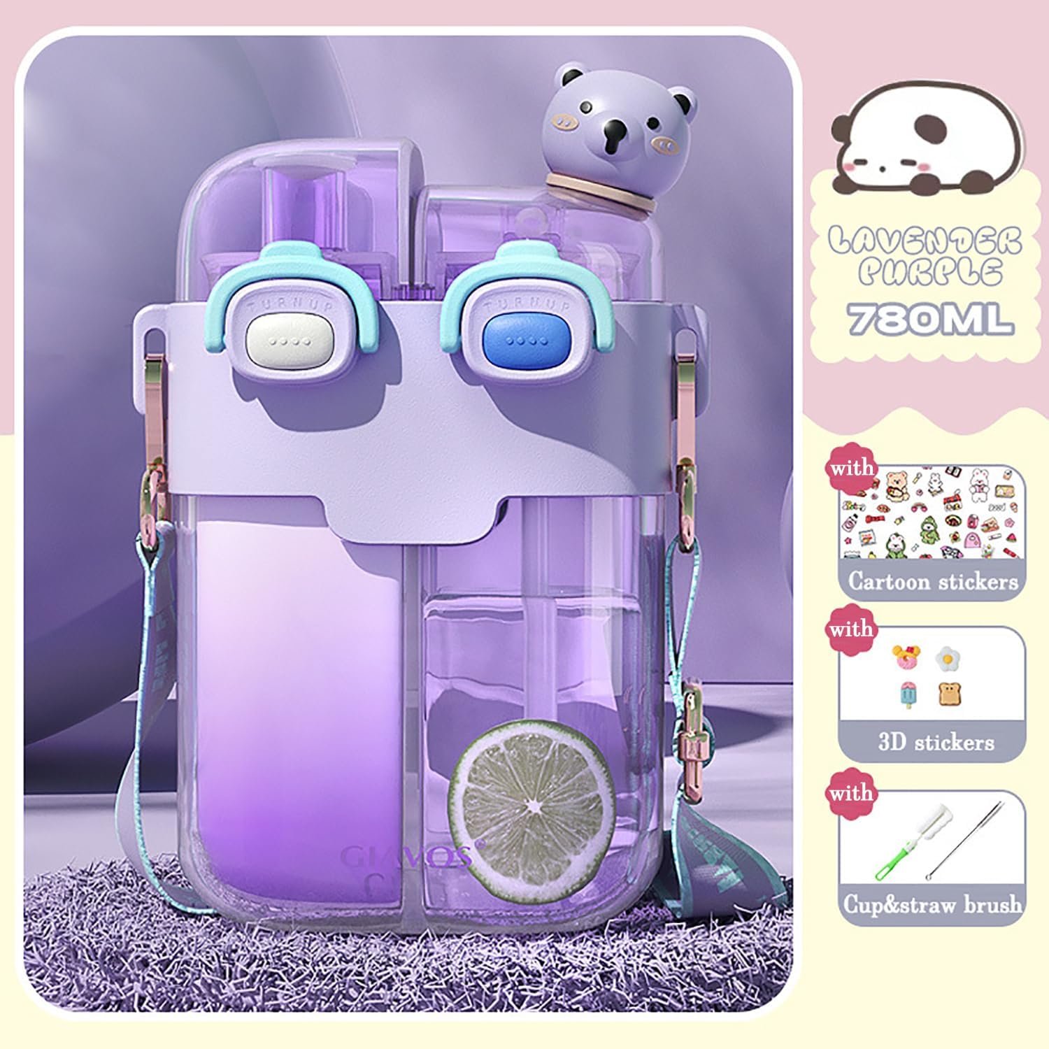 TourKing 26oz Kawaii Water Bottle With Strap, Split Cups For Drinks Dual Compartment, Double-Sided Leakproof Design, Fountain Straw & Portable For Travel Sports (Purple)