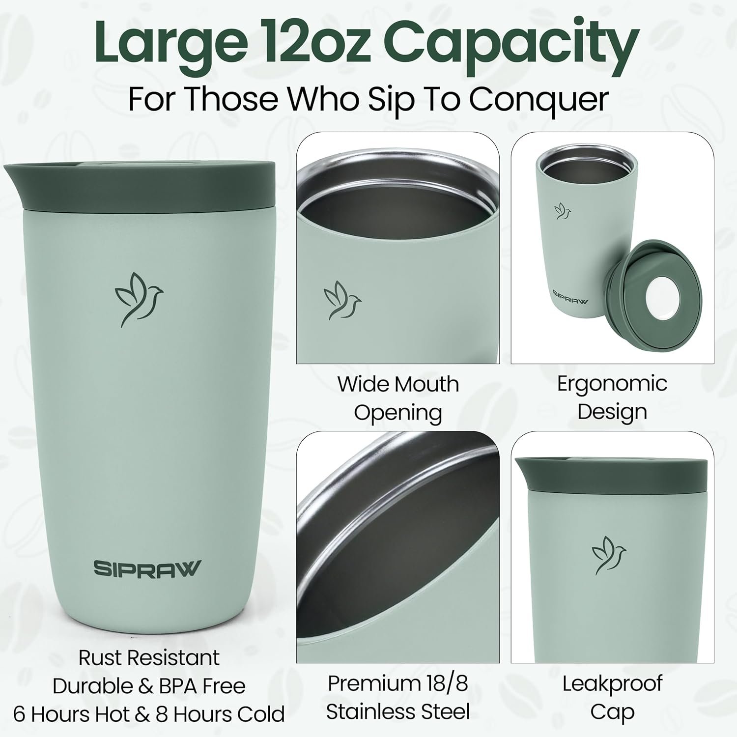 KEEPS HOT OR COLD: Sipraw utilises advanced double-wall thermal insulation technology for maximum temperature retention of hot or cold beverages, as well as ensuring your drink stays cold or hot until the very last sip. Keeps your morning coffee or tea hot for up to 6+ hours and iced drinks cold for up to 12+ hours. You can enjoy your favourite beverage for a long time.