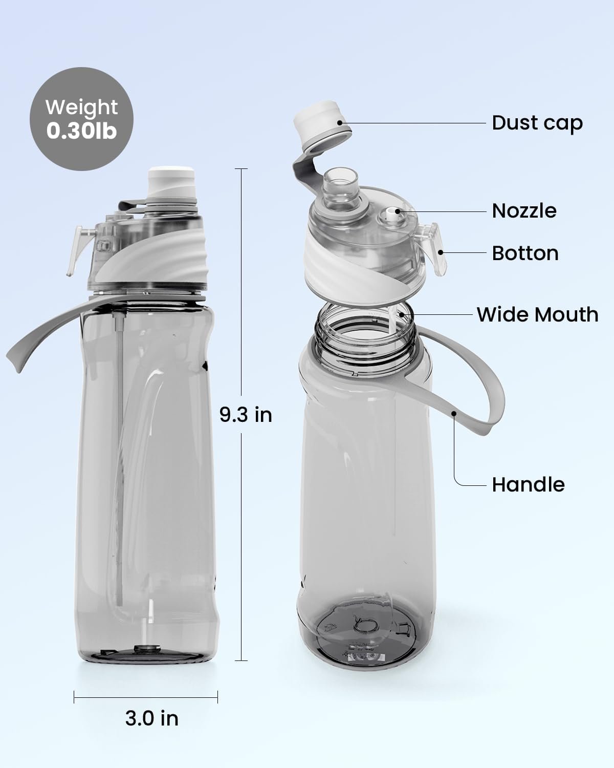 2-in-1 Sip & Misting Cooling Function: This sports water bottle features both drinking spout and misting capability. With just a press, enjoy a refreshing burst of ultrafine mist that instantly cools you down – perfect for staying hydrated and cool during hiking, gym sessions, or daily commutes!