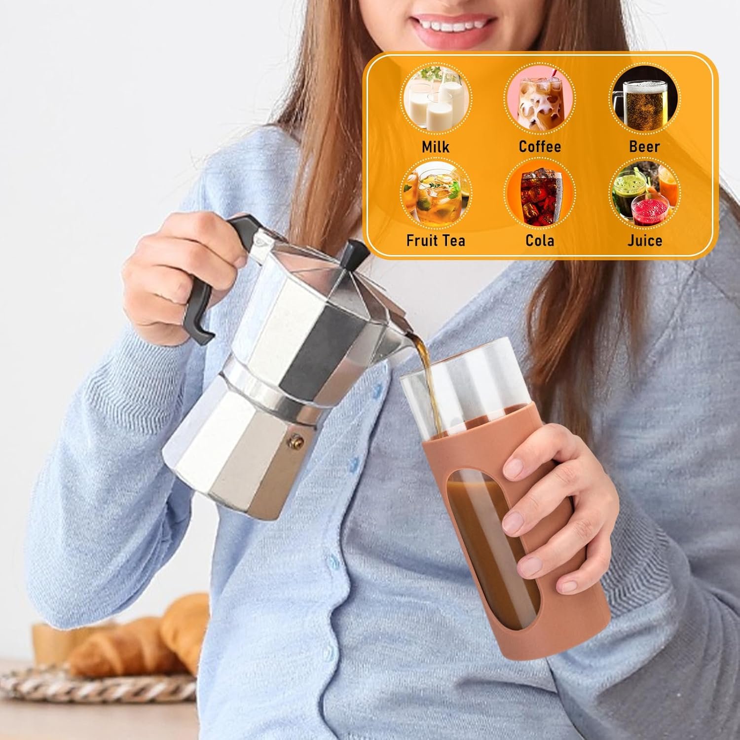 Protective Silicone Sleeve: Runway design silicone sleeve, while providing anti-slip ability for better grip, you can also see the volume of liquid in the glass cup.All parts are BPA free. The sleeve and lid seal are made of food-grade silicone.