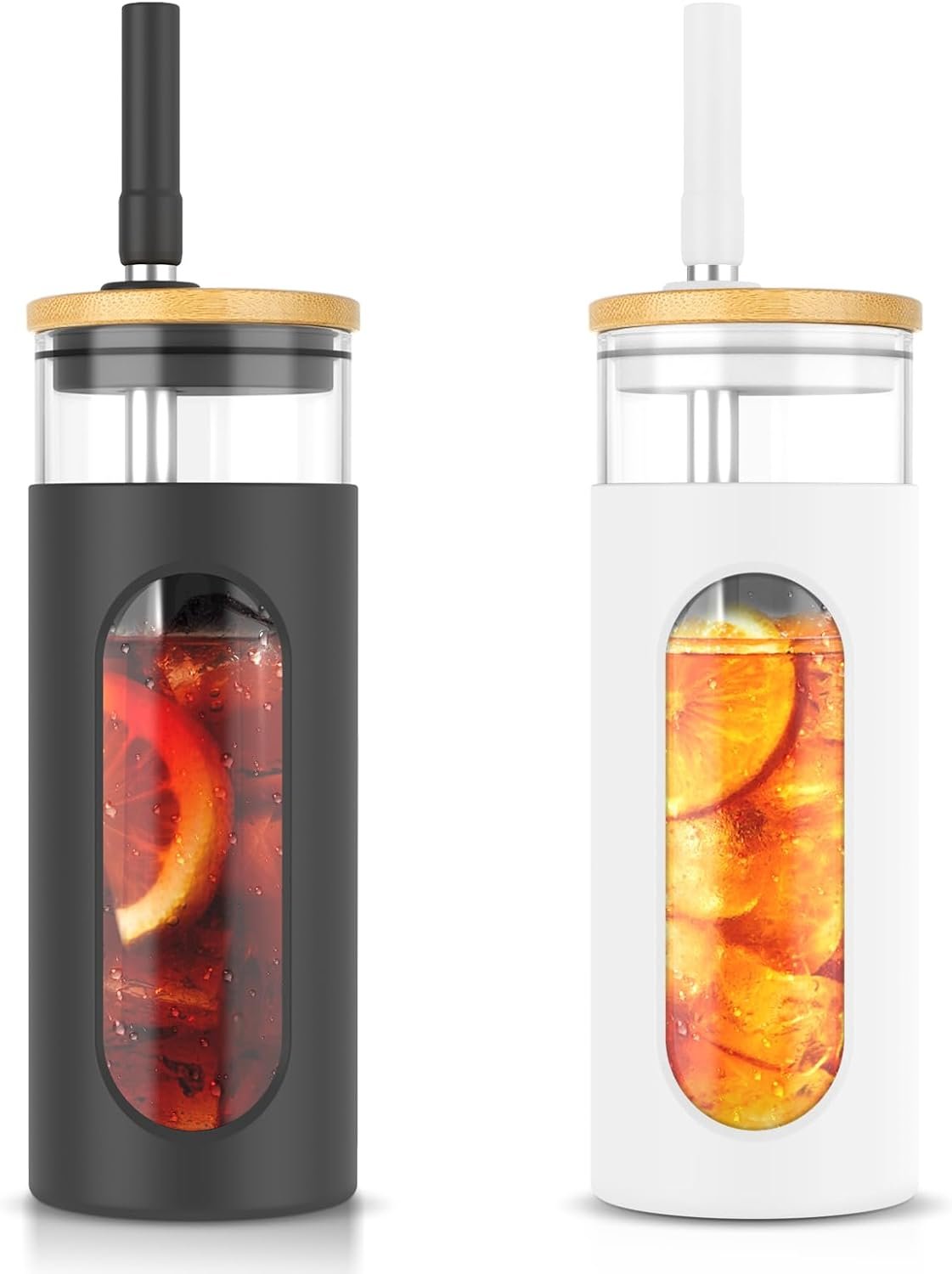 The tronco 20oz glass tumbler with lid and straw is made of premium borosilicate glass.Everything tastes better in glass. You can enjoy your beverages on-the-go. The runway designed silicone sleeve provides a non-slip grip,reduce condensation but not mean no sweat.You can also see the volume of the liquid in the cup which will remind you drinking water. No need to remove silicone for cleaning. The bamboo lid prevents splashes for on-the-go.The lid should been hand wash only. CARE & USE INSTRUCTIONS◉Though it is borosilicate glass, it still fragile and may break upon impact. Please use appropriate caution.◉Do not microwave.Do not freeze or leave in your car in freezing weather.◉The tumbler and straw are dishwasher safe. The lid should be hand wash only. ◉If your tumbler breaks or cracks, dispose of immediately.Height of tumbler:9.29inchesOuter Diameter of tumbler: 2.87 inchesCapacity: 26oz Material:Borosilicate glass,Silicone Sleeve and Bamboo Lid,Stainless Steel Straw + Silicone Nozzle