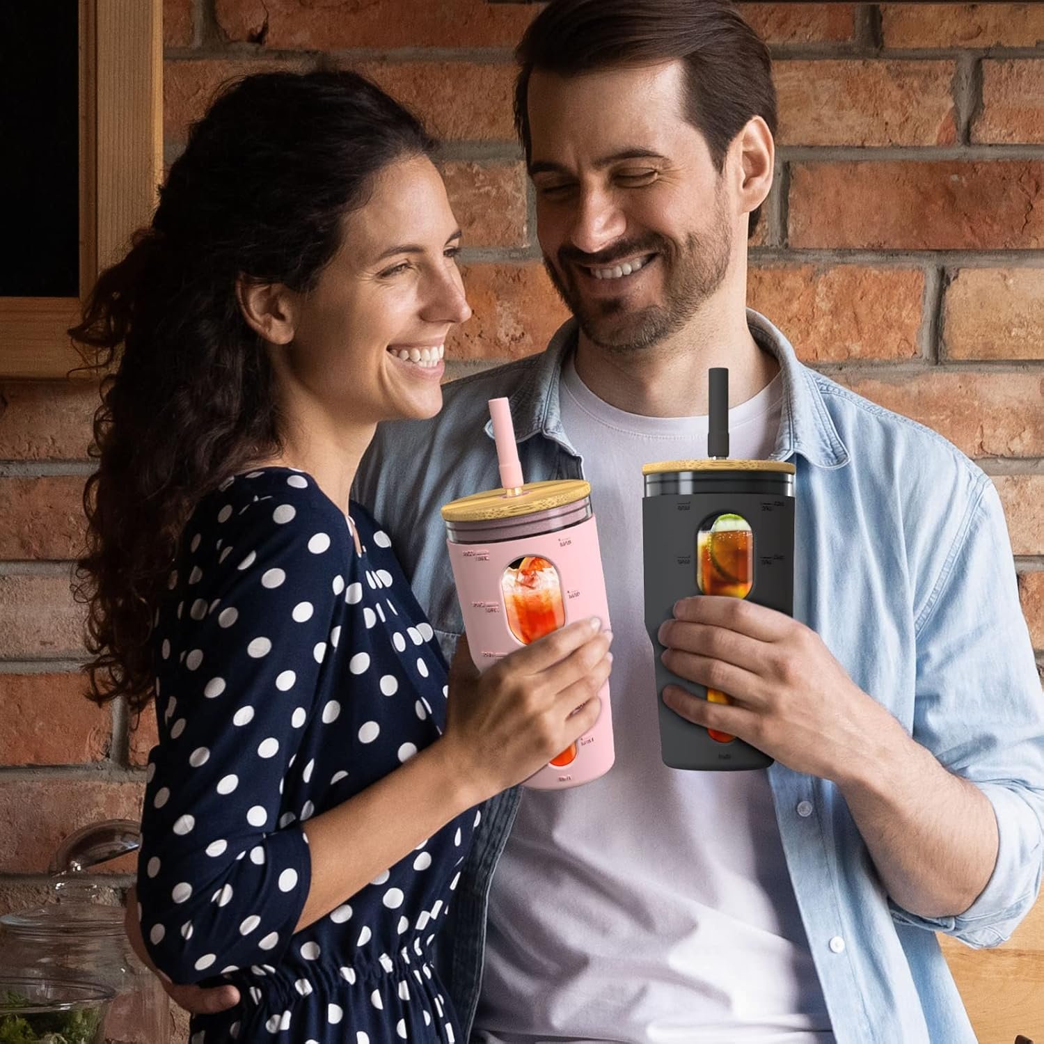 Sturdy Glass Tumbler with Straw and Lid: Made of high borosilicate glass; withstands temperatures from -4℉ to 266℉; features a time marker to track water intake; includes a silicone sleeve and two nozzles for different liquid thicknesses