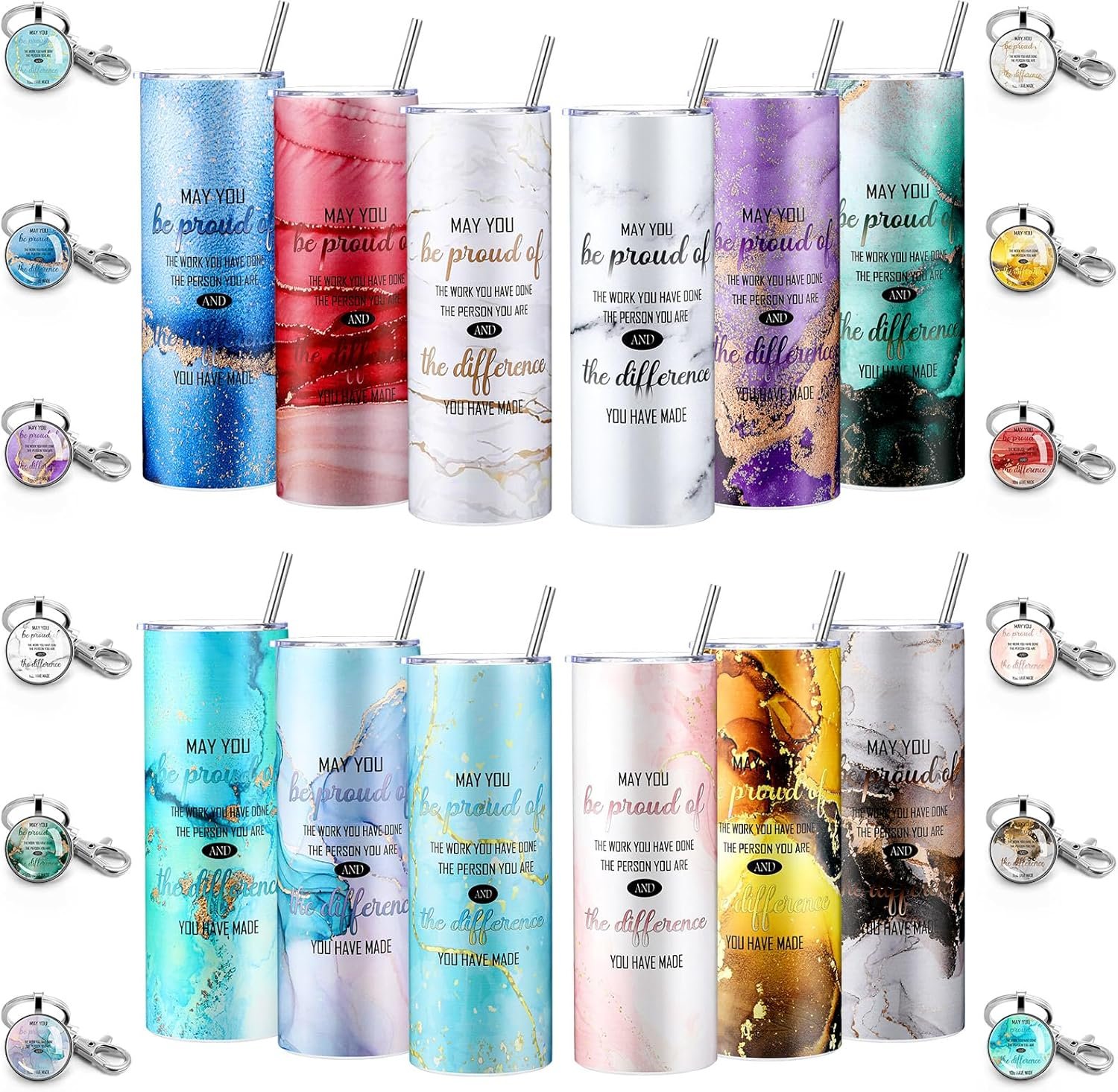 Christmas Employee Appreciation Gifts: this set comes complete with 12pcs 20 oz inspirational Stainless Steel tumblers with lid, straw and 12 pcs motivational keychains; suitable as Christmas appreciation gifts for employee, coworker, team