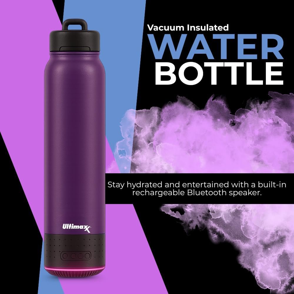 Ultimaxx Vacuum Insulated Premium Water Bottle with Rechargeable Bluetooth Speaker – Steel Double Wall Design + Lights, Convenient drinking spout, Lid Lock, and Carry Handle (700ml/23.6 oz) Purple
