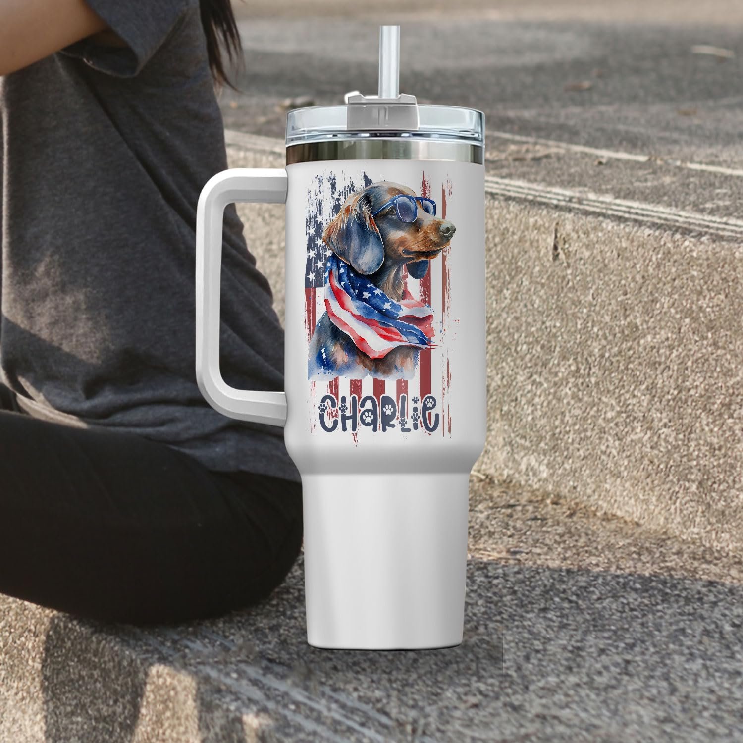 US Flag Dachshund Dog Dad Insulated Tumbler Patriotic 4th of July Gift Idea Customized Name Tumbler Personalized With Lid Engraved 40oz with Lid