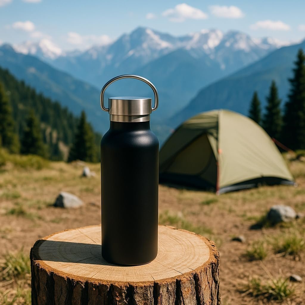 Vacuum Insulated Water Bottle 17oz – Stainless Steel, Double Wall Bottle, Leakproof, BPA-Free, Portable Handle, Keeps Cold 24h & Hot Coffee12h – Matte Black