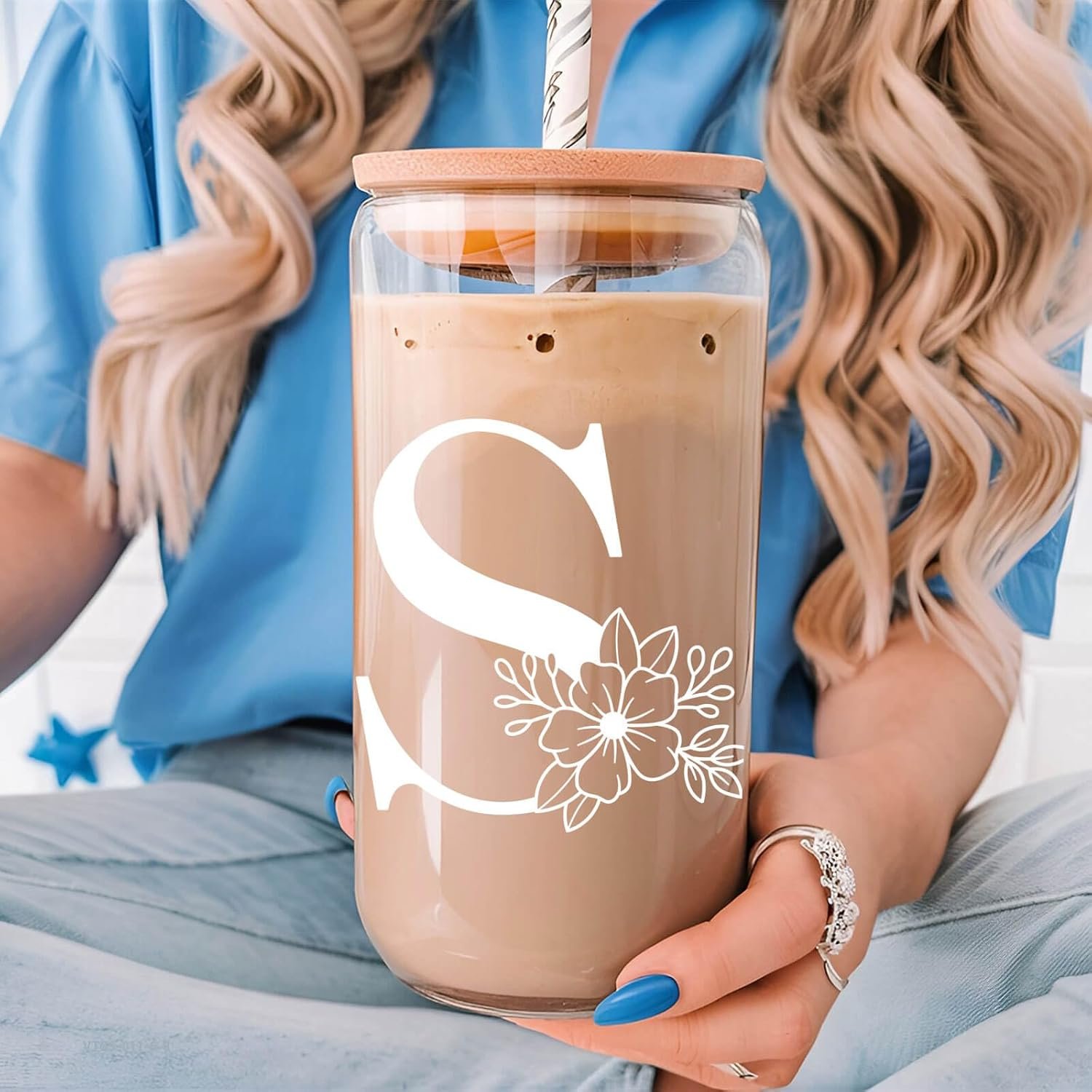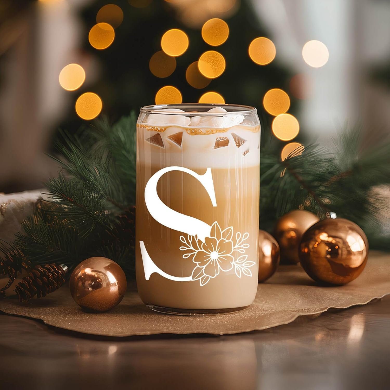 Vanteen Initial Glass Cup, Monogrammed Gifts for Women, 16 oz Glass Cups with Lids and Straws, Coffee Smoothie Beer Glass Personalized Christmas, Birthday Gifts for Her Mom (S)