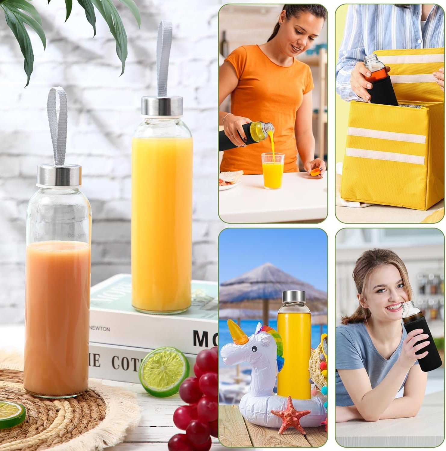 Multipurpose Use: our 18oz glass juice bottles with sleeves and stainless steel lids are versatile for various applications, from storing hot or cold drinks, still or carbonated drinks, leftover drinks to crafting sand art crafts, this bottle is a good fit for all
