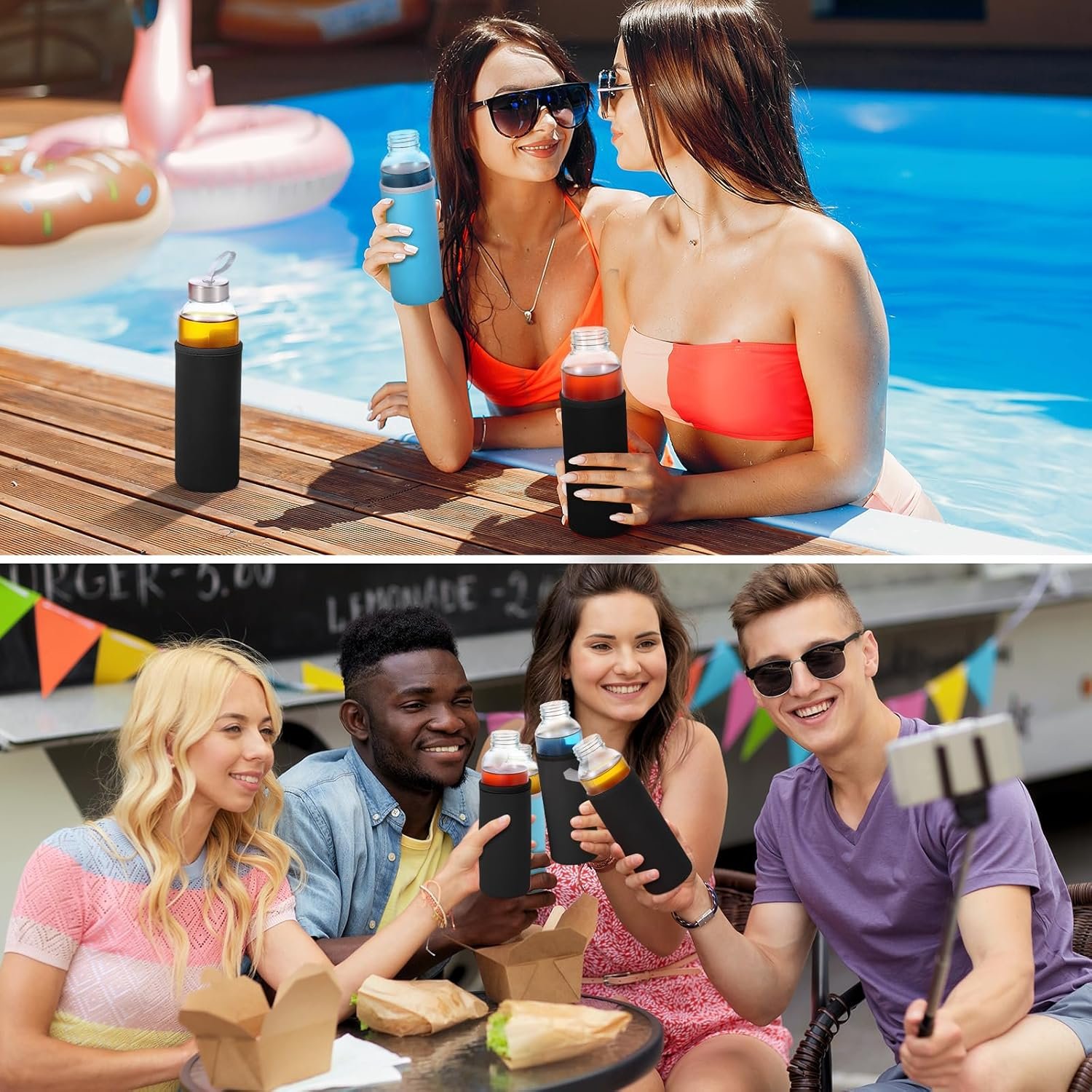 Our 12 piece set of reusable juice bottles glass with lids come with matching protection sleeves in black color. The sufficient sleeve provide additional insulation needs andreplacement needs