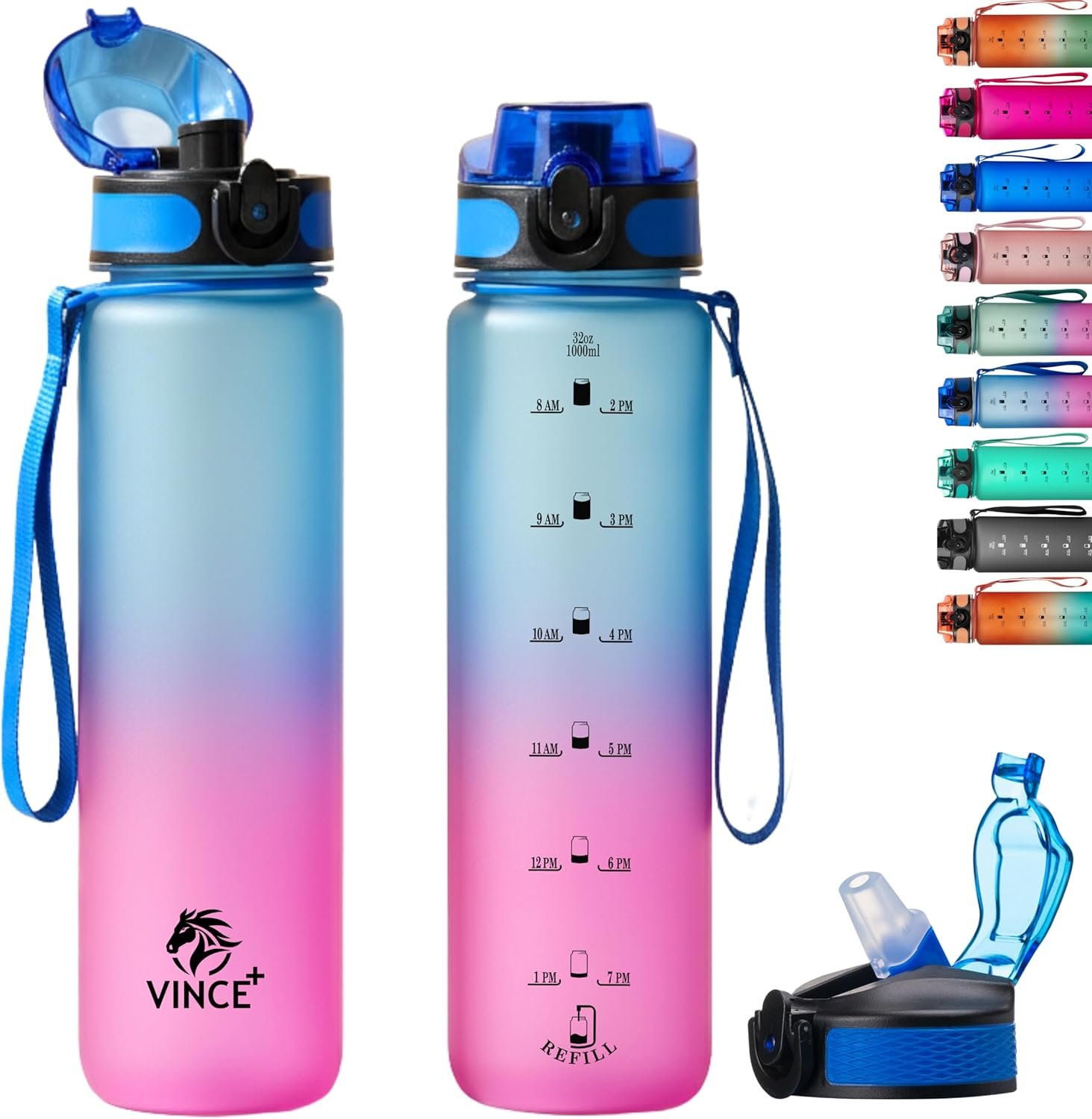 Vince+ Motivational Water Bottle with Time Marker – BPA/BPS-Free Tritan Bottle – Leak-Proof Design with Straw & Fast Flow Lids – Perfect for Gym, Outdoor Sports, and Fitness (Gradient blue/magenta)