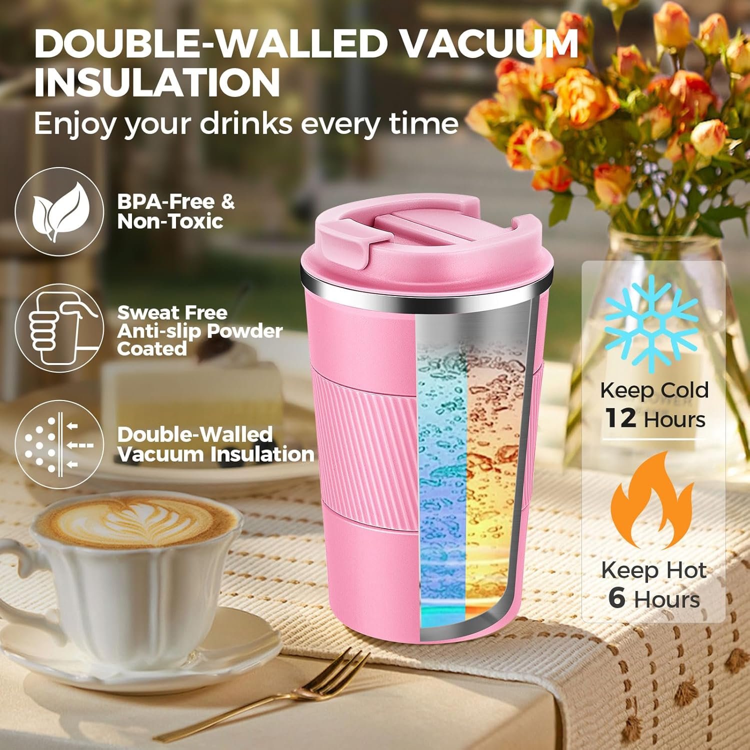 【Double Wall Insulation Technology】Volhoply Travel Coffee mugs are made with double-wall vacuum insulation technology,which can keep your drinks warm for more than 6 hours and cold for more than 12 hours,both indoors and outdoors.You can enjoy your favorite drinks for a long time,keeping every sip fresh until the last drop!