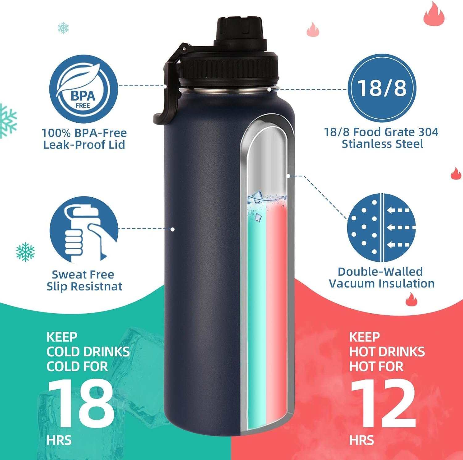 【Vacuum Insulation and Wide Handle】Designed with double walled vacuum insulation, featuring superior insulation and a condensation proof design. Volhoply Water bottle can keep hot for 12 hours and keep cold for 18 hours, allowing you to enjoy your favorite flavor in the long run. Our lids handle have been improved.Able to hold three fingers, relieve finger pressure while walking. Made for outdoor lovers
