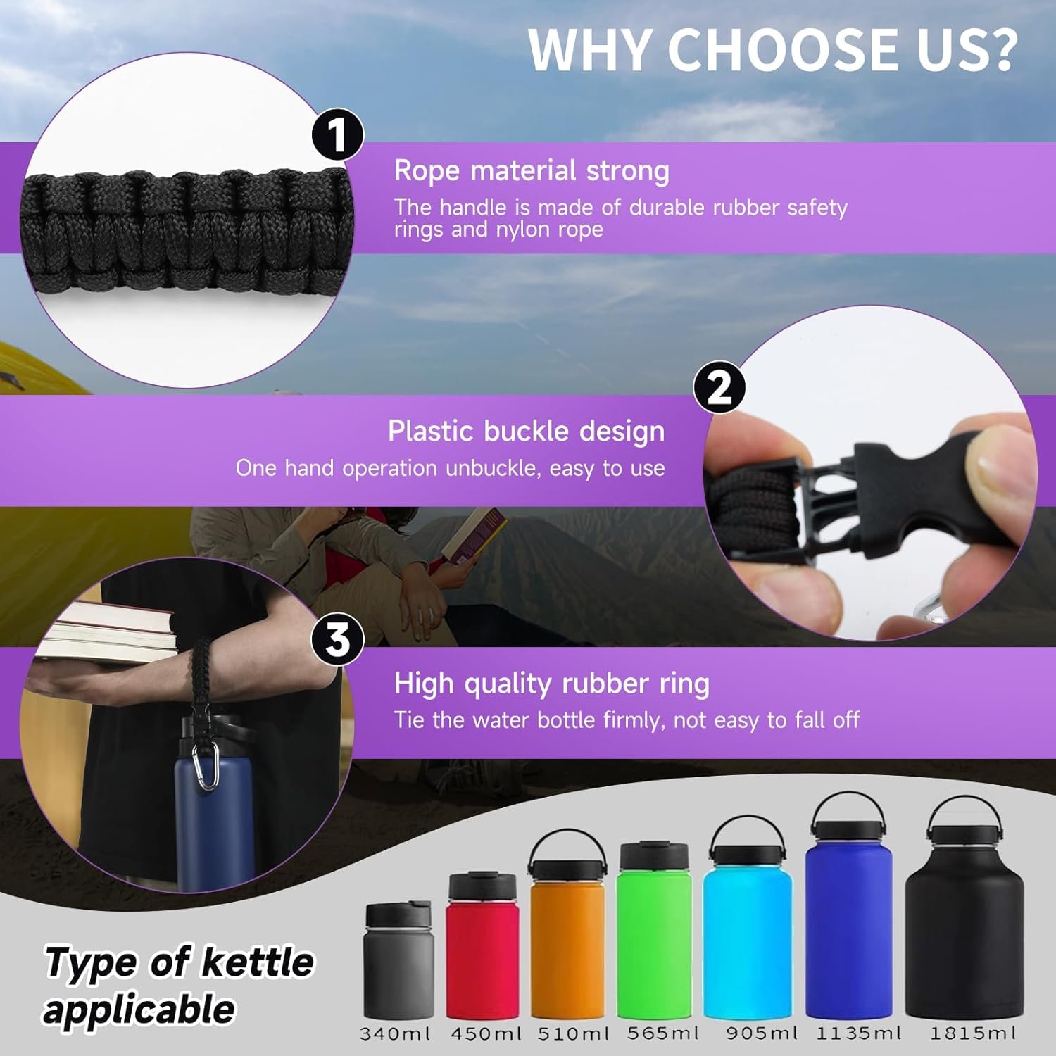 Widely Compatible: This paracord water bottle handle is suitable for most wide-mouth water bottles, including 12 oz, 16 oz, 18 oz, 20 oz, 24 oz, 32 oz, 40 oz and 64 oz capacity water bottles. Whether you are hiking with a large bottle of water outdoors or using a small bottle of water for daily carry, it can be easily adapted and brought convenience.