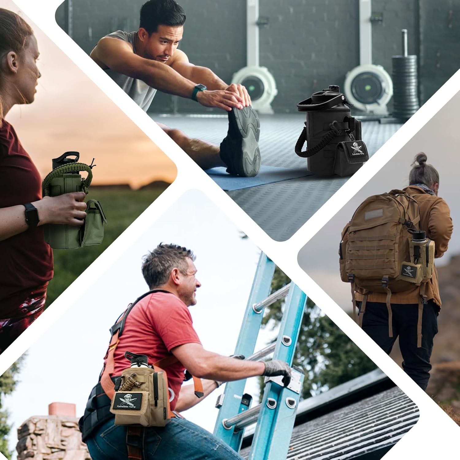 Multiple Carrying Option:The tactical water bottle holder is equipped with two MOLLE back straps featuring metal snaps, allowing it to be securely attached to MOLLE-compatible gear such as backpacks or battle belts. It also includes a sturdy hook, ideal for holding keys or other small tools