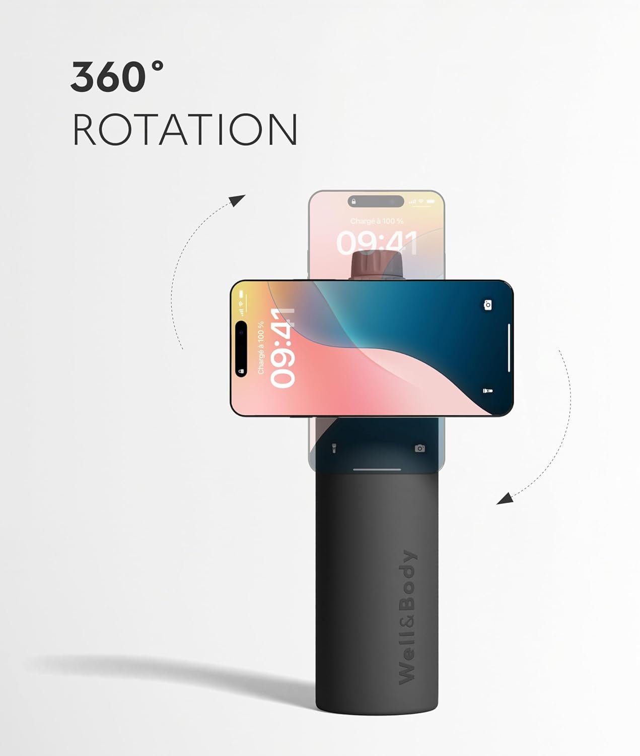Well & Body Insulated Magnetic Water Bottle Magnet’O 25 oz | Stainless Steel, Compatible with MagSafe, Adjustable Angle, Leak-Proof, BPA-Free, Tripod-Ready, Gym, CrossFit, Fitness [Black Edition]