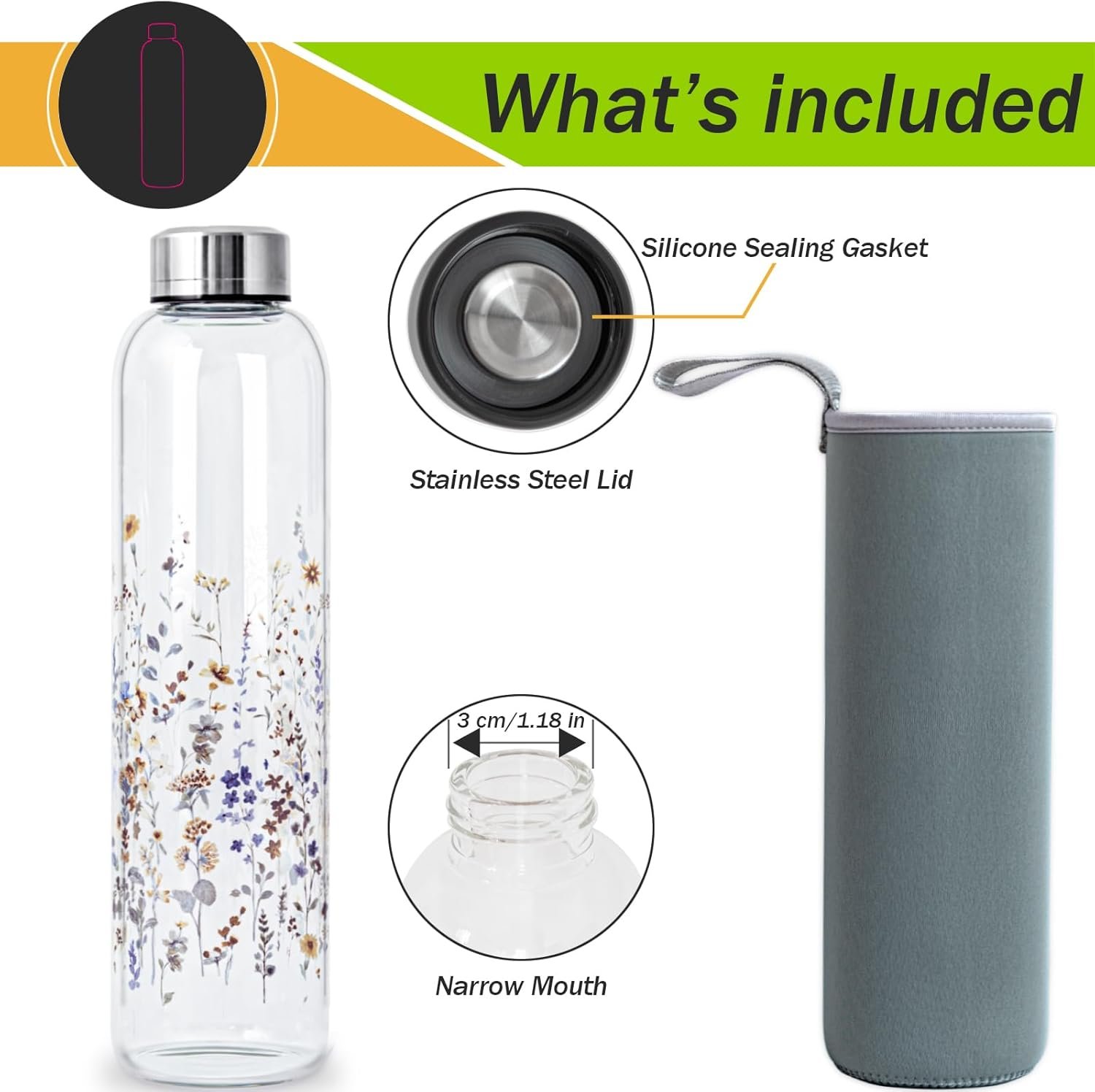 Leakproof. The secure stainless steel lid comes with a silicone sealing gasket, preventing leaks effectively when the glass bottle is turned upside down. Small mouth for spill-proof drinking