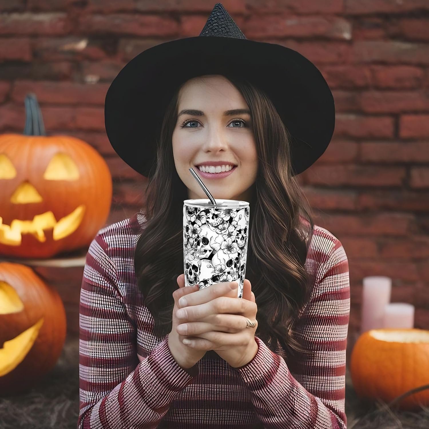 Whaline Halloween Skull Tumbler Stainless Steel Travel Tumbler with Lid Straw and Brush Spooky Coffee Mug Cup for Women Travel Birthday Horror Gift