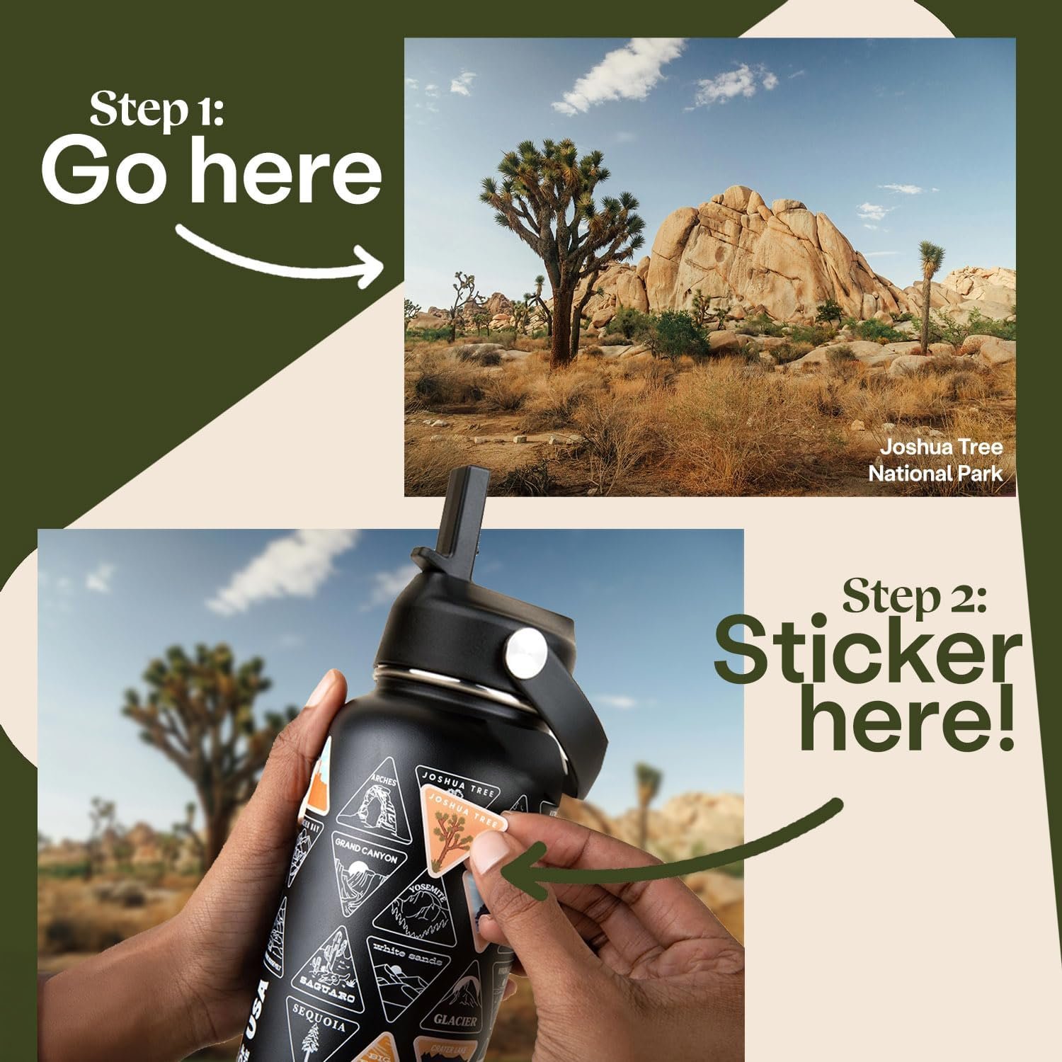 The OFFICIAL Fifty States Bucket List Bottle: No need to settle for replicas! Track all of your USA adventures with our intricately developed water bottle and corresponding colorful souvenir stickers