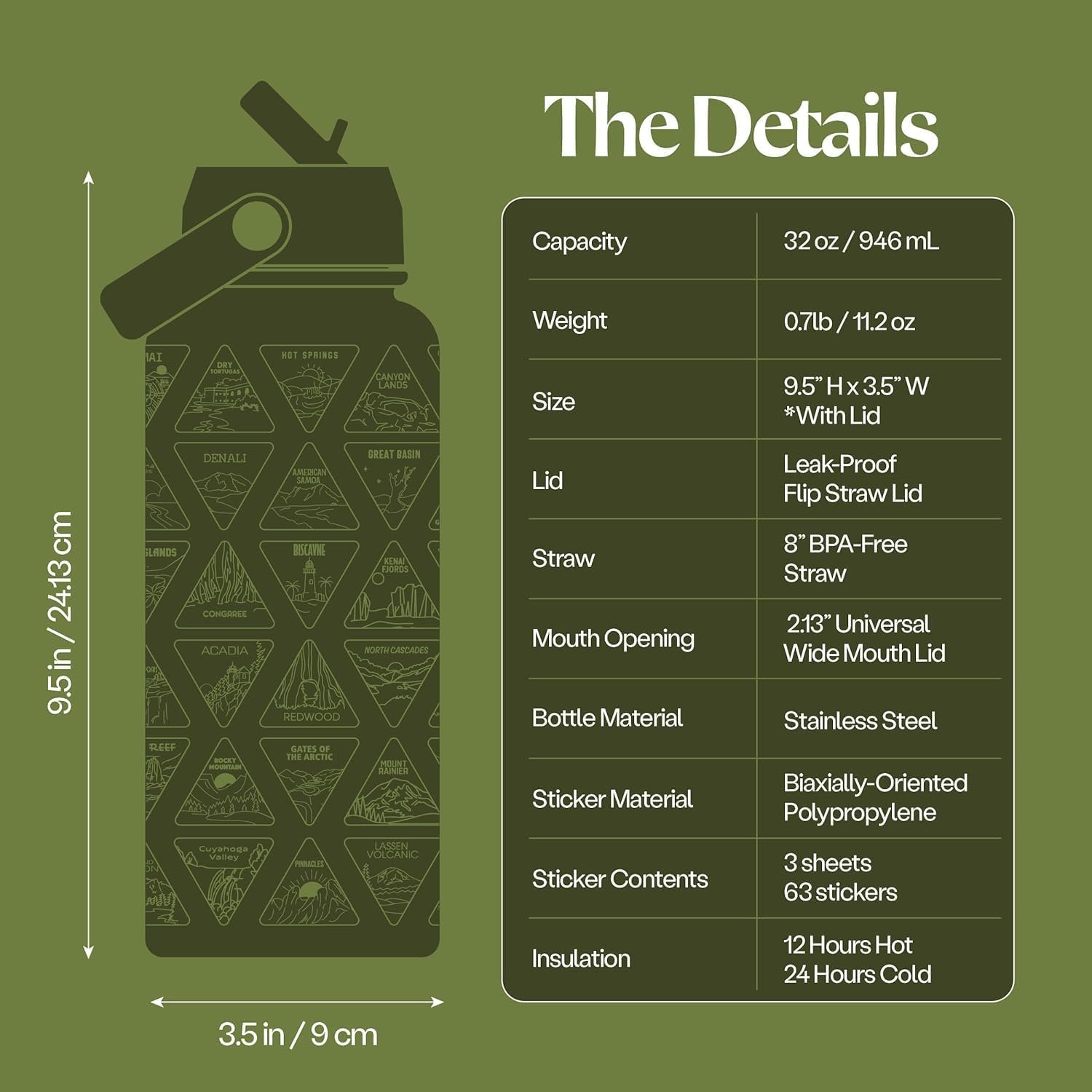 Wondery The Original Parks of the USA® Water Bottle With 63 Waterproof Stickers of Parks (USA), 32 oz Stainless Steel Insulated & Vacuum Sealed Water Bottle, National Park Gifts – FOREST