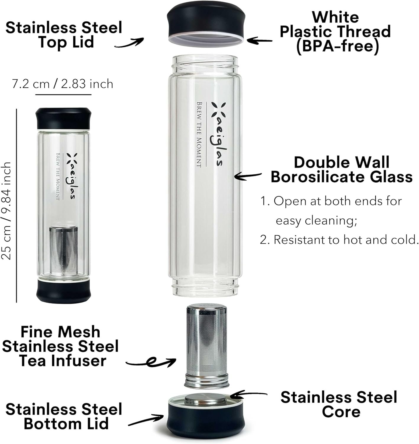 Travel tea mug. Leakproof tea thermos with infuser for office yoga fitness, Tea flask for hot tea warm tea ice tea drinks Brew your tea on the go with tea infuser tumbler and rust proof steeper basket Drop loose leaf tea cup blend or tea bags into the infuser steeper and fill the travel infuser bottle with hot water or cold water for iced drinks in the fridge The integrated screw-on strainer can be used to steep tea or removed to make fruit infused water coldbrew coffee water bottle double glass wall and stainless steel filter. Durable double wall borosilicate glass insulated tea cup to keep drinks hot or cold Leakproof rustproof odor free vacuum system with premium twist-on stainless steel infuser and flat lids to infuse looseleaf tea Easy to clean and dishwasher safe widemouth glass water bottle tea maker For green black white matcha moroccan jasmine yerba mate mint roiboos earl grey oolong puerh tea leaves herbs and fruit infused water Elegant design stylish and nature bamboo inspired portable tea mug with infuser and lid and tea diffuser single tea cup with infuser and lid travel fits into car holder to prepare tea Neoprene travel sleeve included to protect your portable infusion bottle and tea pot Togo infusion transparent glass tea bottle to steep your tea to go with infusor and making fruit water beverage All-in-one double walled tea steeper ball spill proof shatterproof heat resistant tea brewer with canister Botella para agua y tea de cristal ultra fine mesh glass mug with infuser for traveler insulated tea pot with metal lids Durable tea thermos tea infuser tea strainer flask with insulated sleeve 14 ounce clear glass tea cup mug with cover