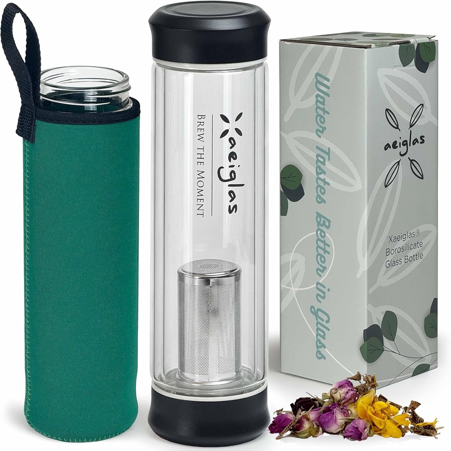 Xaeiglas Tea Tumbler with Infuser – Double Wall Glass Travel Mug with Stainless Steel Filter – Tea Infuser Bottle for Loose Leaf Infusions and Fruit Infused Water (Classic)