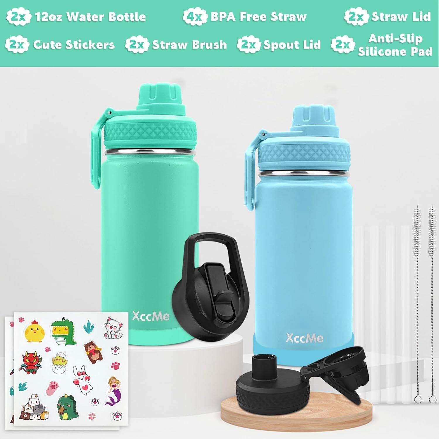 【PERFECT SET】: Each Kid Water Bottle comes with two replacement lids, 2 plastic straws, a straw brush,1 non-slip coaster and 20 personalized stickers, perfect as school gifts, birthday gifts, Christmas gifts for kids.