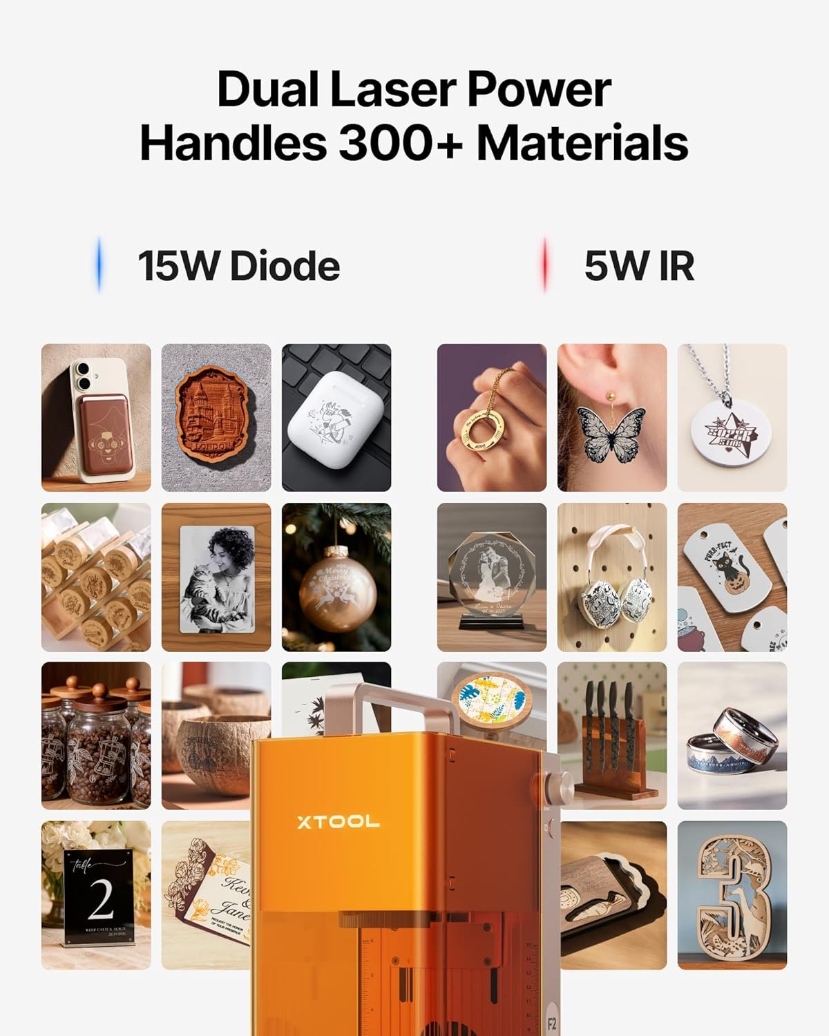 Dual-Laser Versatility, Endless Creation: Our 15W Diode & 5W IR dual-laser combo makes this laser engraver truly versatile, unlocking more possibilities on 300+ materials. The 5W IR delivers deep, dark, vivid color marking on metal, while the 15W diode expertly handles 3D embossing and cutting through thick materials.