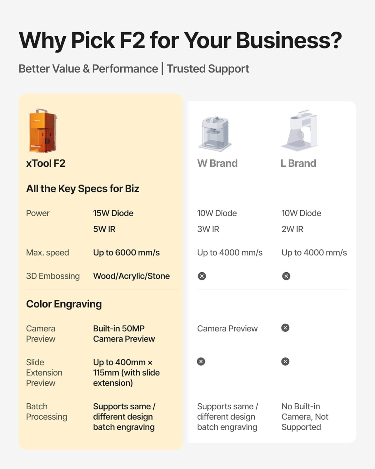 For the same results across various materials, F2 completes jobs 1–5× faster than typical portable laser models.
