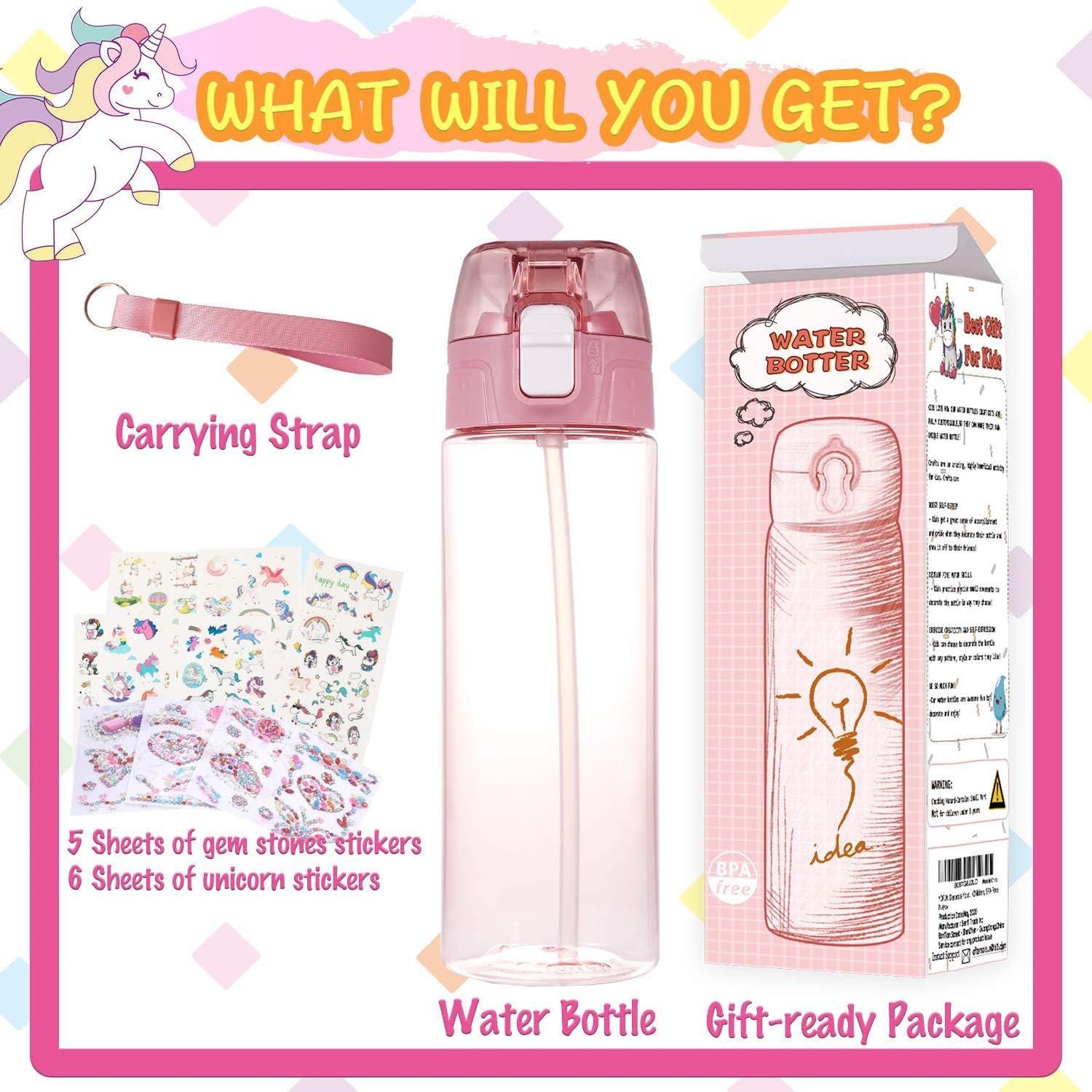 【BUILD YOUR OWN WATER BOTTLE】Kids have the chance to build a unique water bottle with gems & unicorn stickers, and they will love to drink more water in school