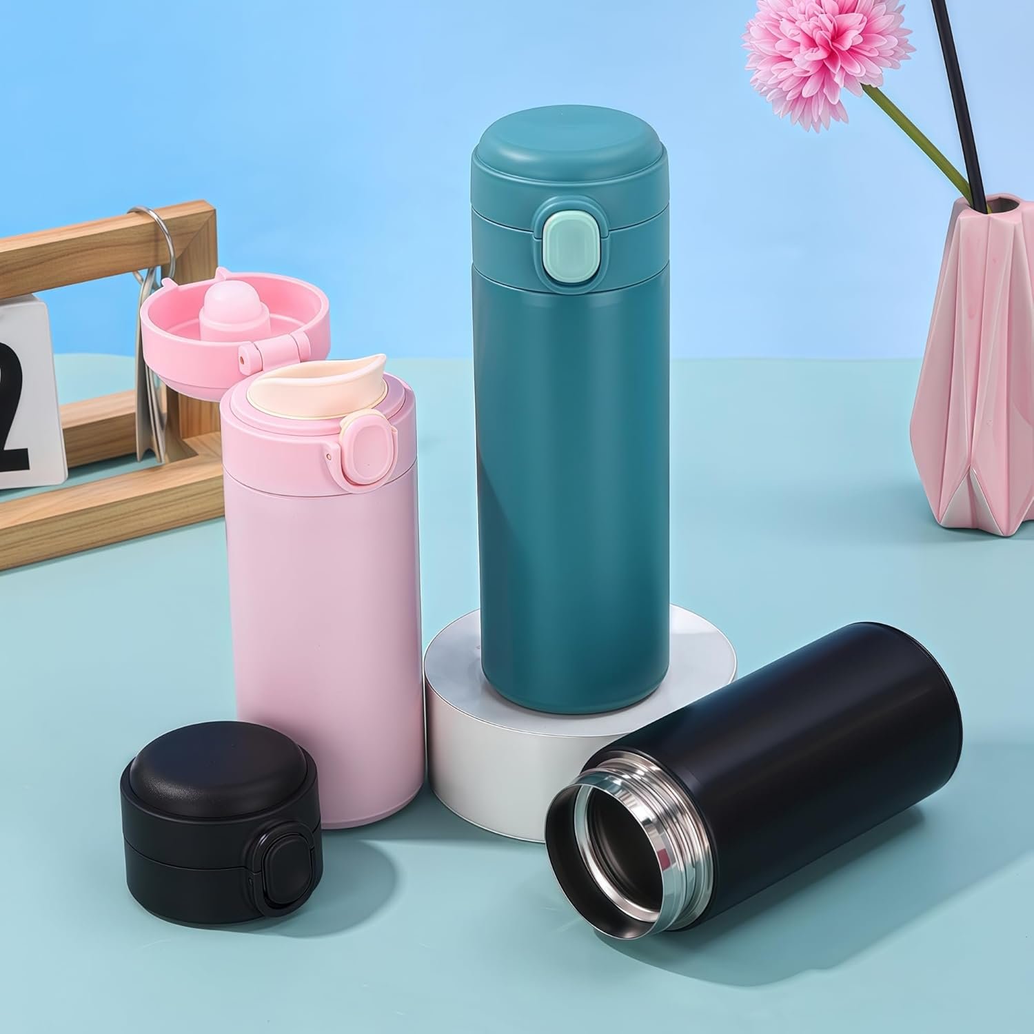 Convenient Drinking — One click opening, easy to open and clean. Round cup mouth fit the lip shape. Push up to close the lock, and push down to open the lock. Prevent accidental unlocking and pack the flask in the bag without leakage worry