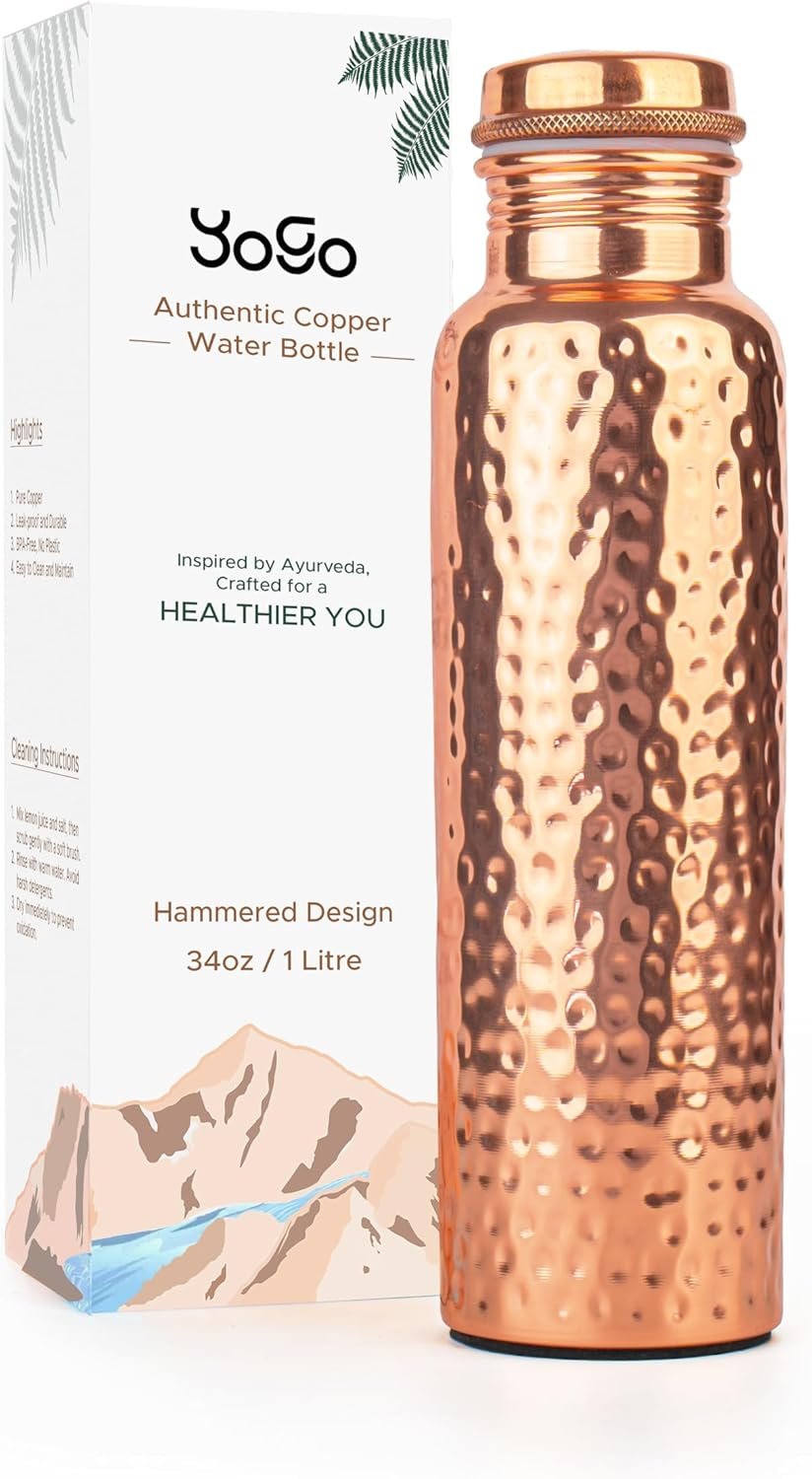 YoGo Pure Copper Water Bottle – 34 Oz Hammered Ayurvedic Copper Water Bottle for Drinking – Leak-Proof Lid, Handcrafted copper Bottle for Daily Use