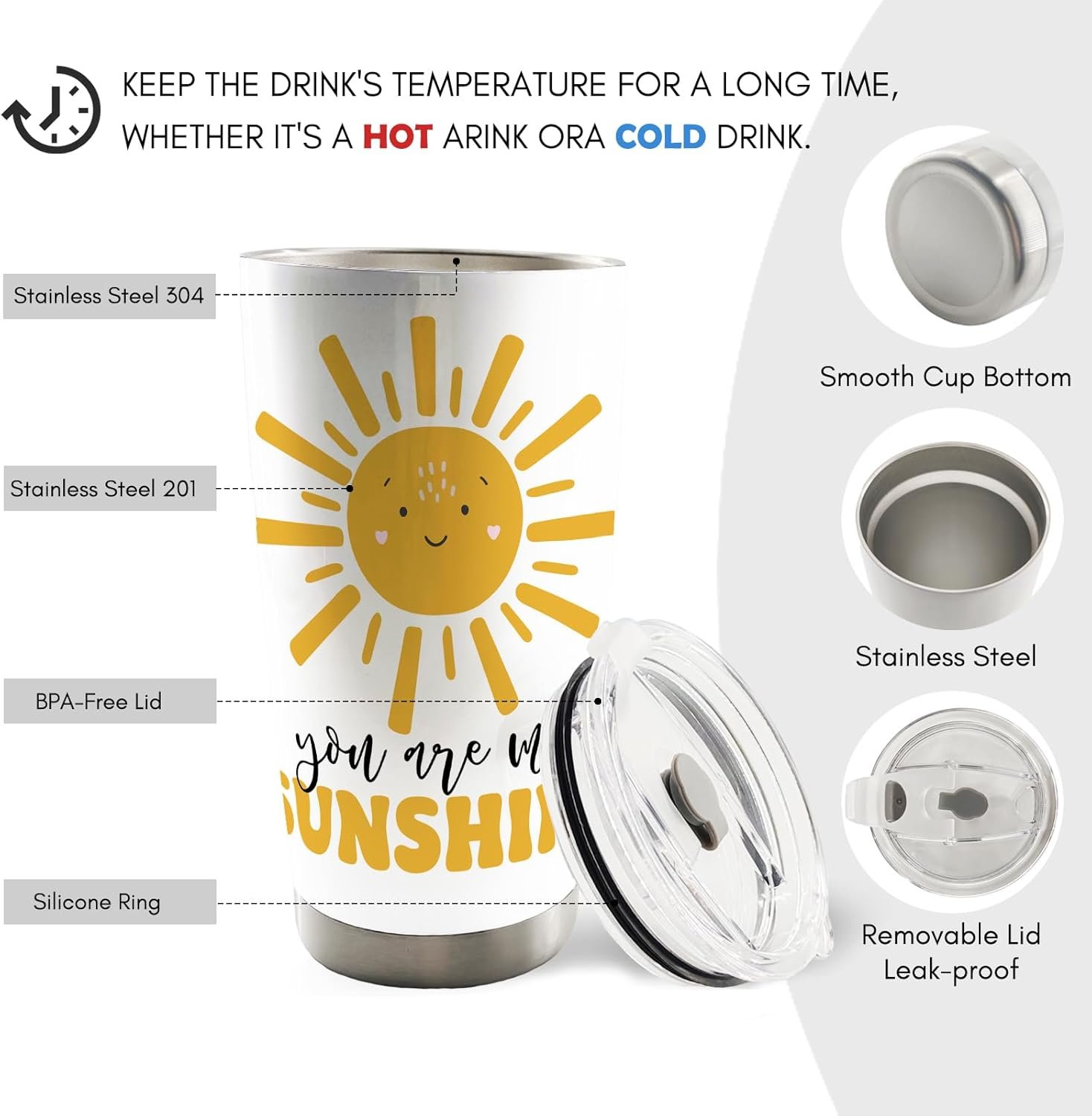 【User-Friendly Design】:The tumbler features an easy-to-grip body shape with beautifully and clearly printed patterns. Made from long-lasting, safe stainless steel, it is easy to clean. The silicone ring and plug on the lid fit tightly, providing up to 6 hours of insulation and leak-proof performance. The lid combines a snap closure with a straw hole for a comfortable user experience. You can pour in your hot and cold drinks, it meets your needs, keeping your drink insulated and tasting its best.