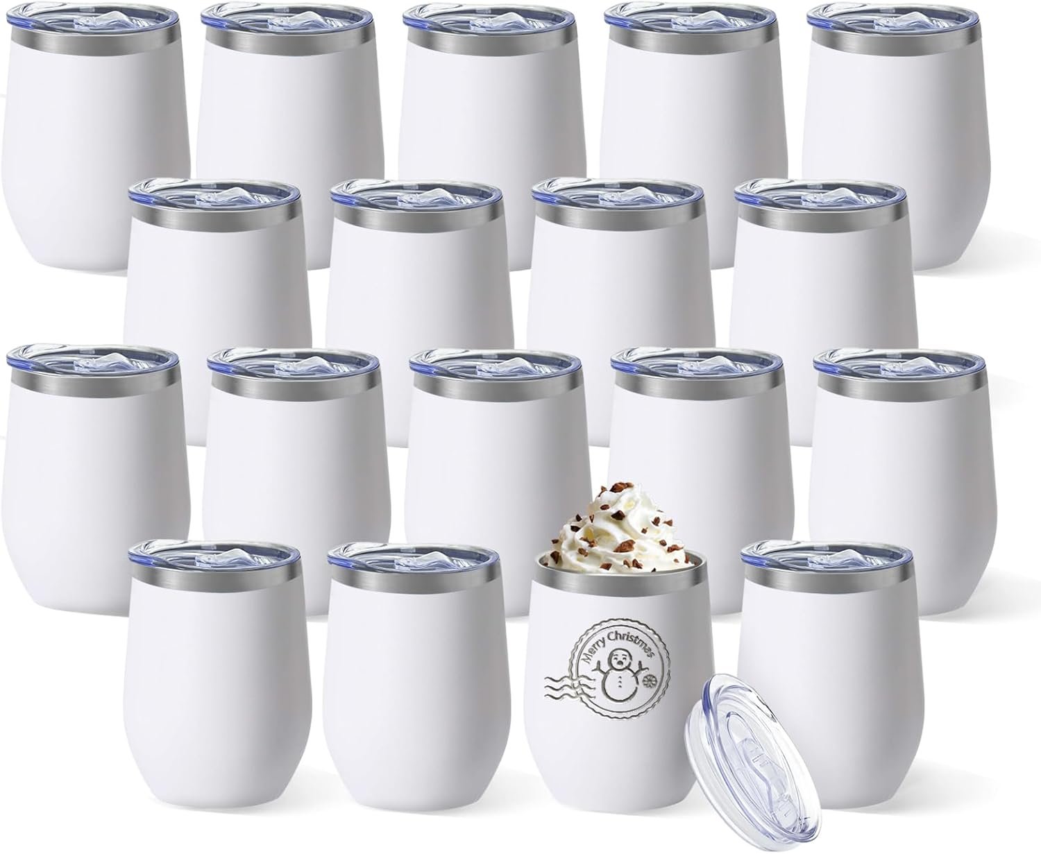 YOUKE OLA 18 Pack Stainless Steel Wine Tumbler with lid, 12oz Insulated Powder Coated Wine Tumbler Stemless Double Wall Vacuum Wine Glass Coffee Tumbler Bulk for Laser Engrave, DIY Gift, White