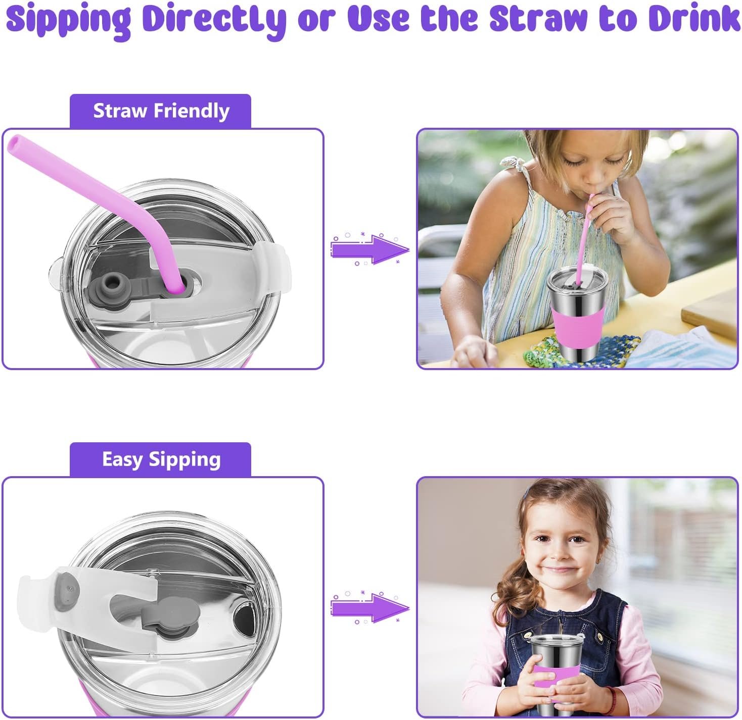 【Food-grade Material & 2 Ways to Use】: Made of food-grade eco-friendly and BPA-free 304 stainless steel, it won’t rust for a long time use, safe and perfect for toddlers and elderly parents. The straws are made of flexible silicone, they will not hurt your kid’s teeth or lips. You can sip directly or use the straw to drink, great for milk, juice, coffee, water, tea, etc.