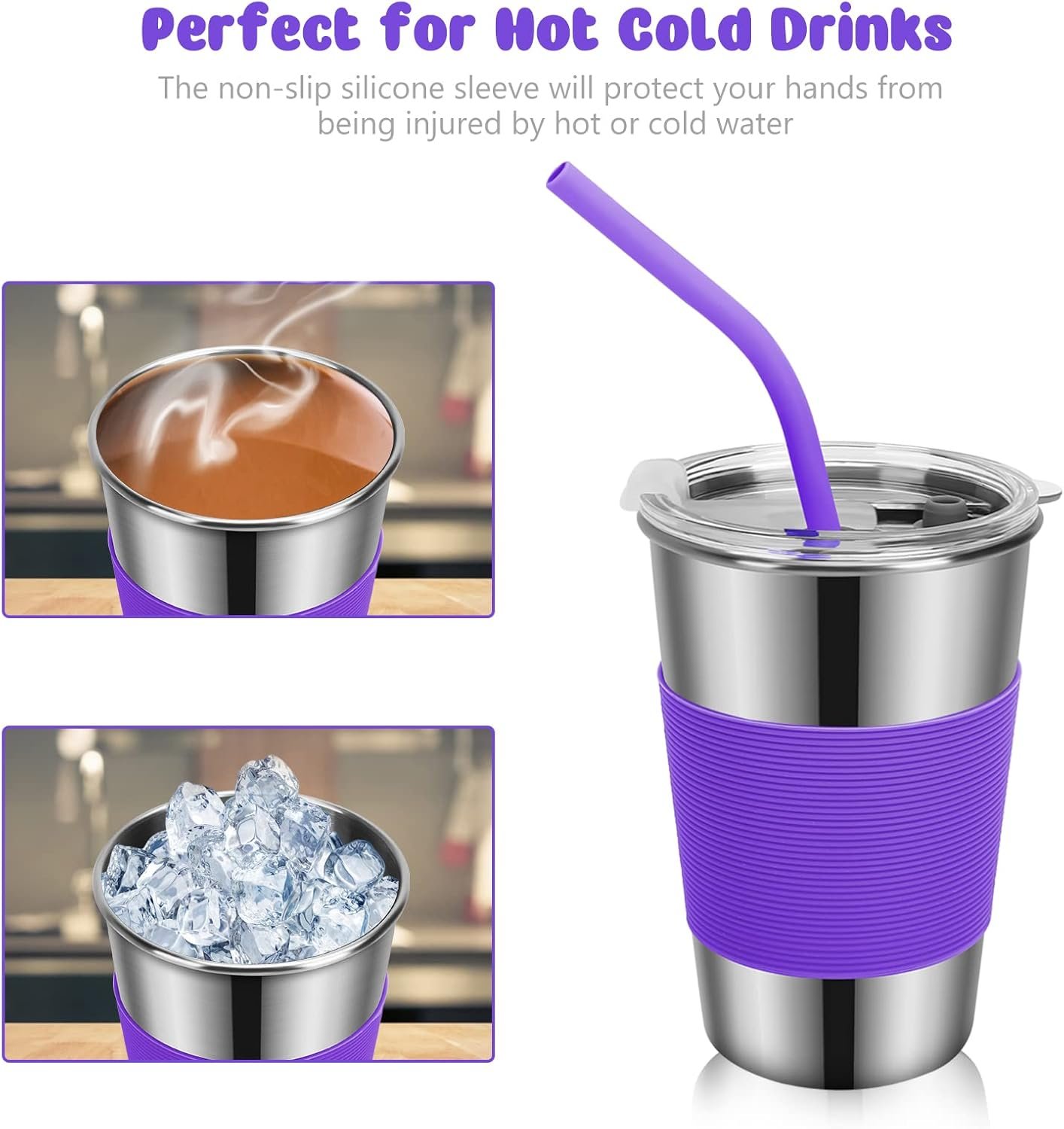 【Easy to Hold & Leak-proof】: The non-slip silicone sleeve can not only protect your hands from burns by hot water but also help you hold the cups more easily. These cups do not leak or spill thanks to the silicone sealing ring on the lid, great helps in preventing your kids from tipping over their drinks. (Note: When you insert the straw, we do not suggest turning the cups upside down.)