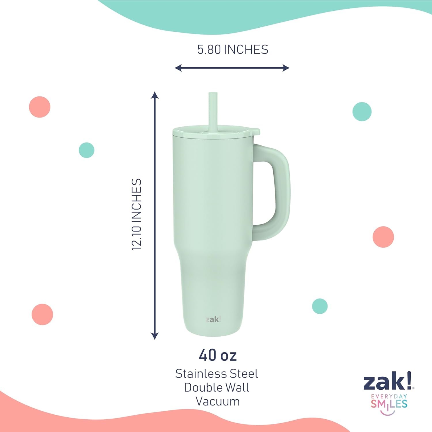 Zak Designs Sutton Travel Tumbler for On the Go, 40oz Stainless Steel with Vacuum Insulation, Silicone Straw, and Carry Handle for Cold Drinks (Icicle Mint Green)