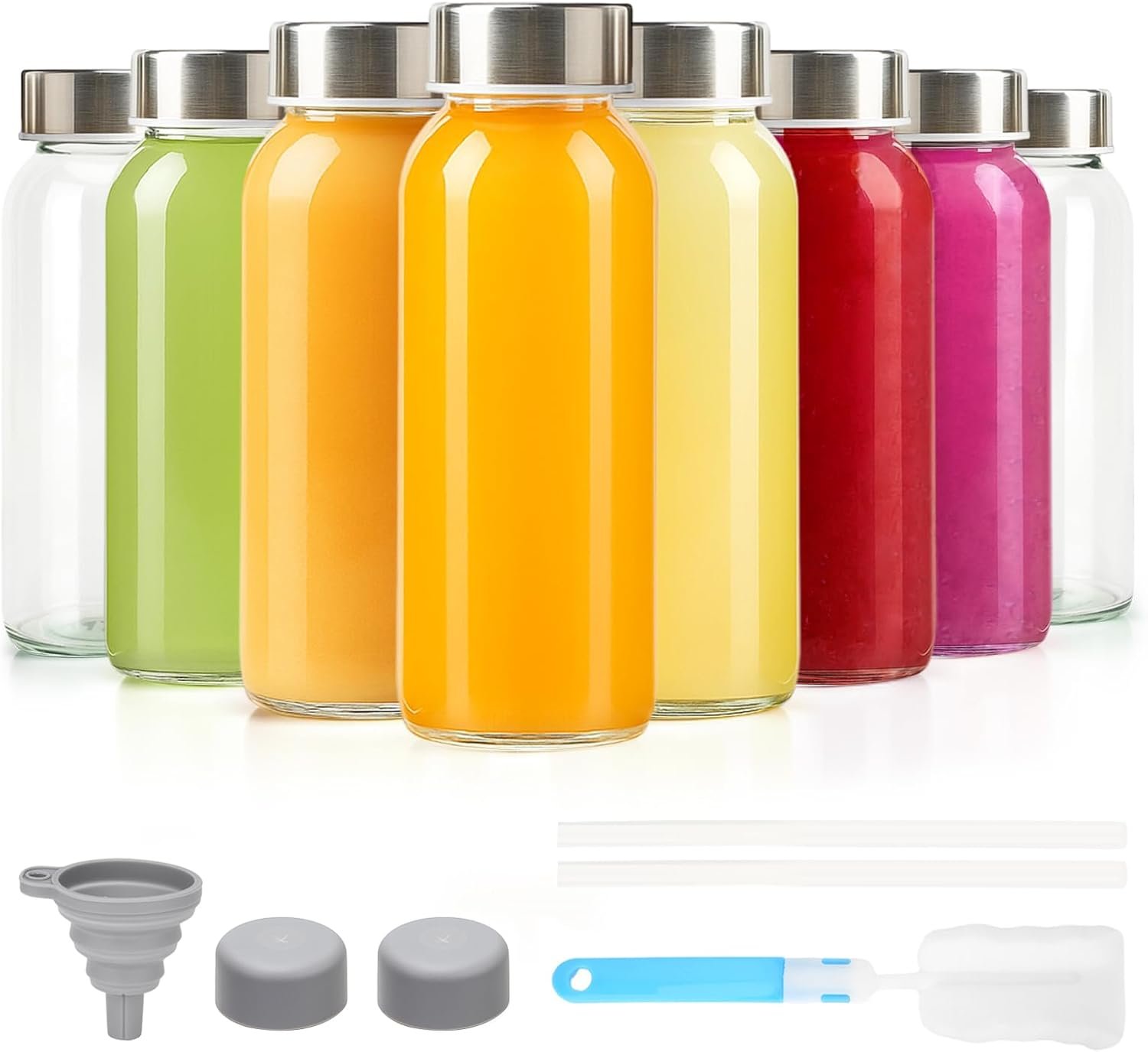 SAVE MONEY WITH THIS VALUE PACK: Juicing Kit Bundle includes : 8 pack clear glass milk bottles with airtight lids, a bottle cleaning brush for easy hand washing, a funnel helps you pour liquids inside the glass juice containers, extra 2 pc silicone lids with straw hole, and 2 pcs reusable straws. Get our juicing jars in bulk packs as gift for your family and friends.