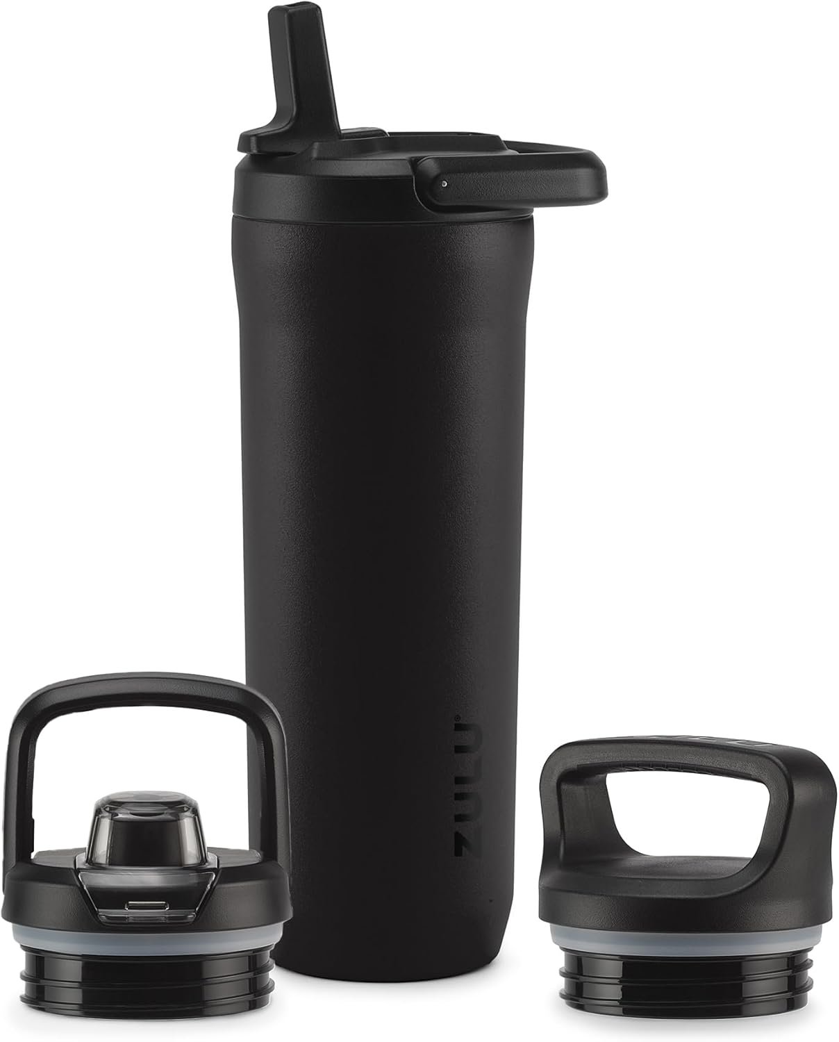 ZULU Base 18oz Kids Stainless Steel Water Bottle with 3 Lids- Straw, Chug, Twist | Double Walled and Vacuum Insulated Metal Thermos | Fits Car Cupholder, Built in Carry Loop, Dishwasher Safe, Black